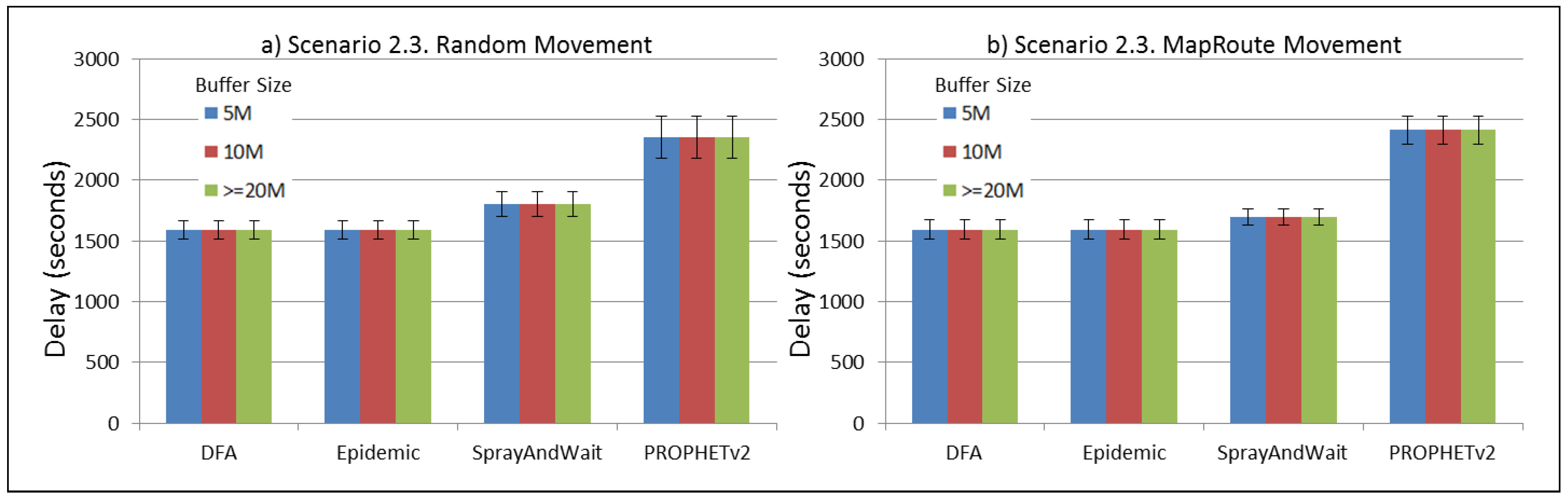 Results for scenario 2.3. Average delay in seconds with different Buffer Sizes, generating 2 kB messages every 1 to 2 h, (a) MAPs moving randomly on the path; (b) MAPs following the path in only one direction. DFA: Distributed Forwarding Algorithm.