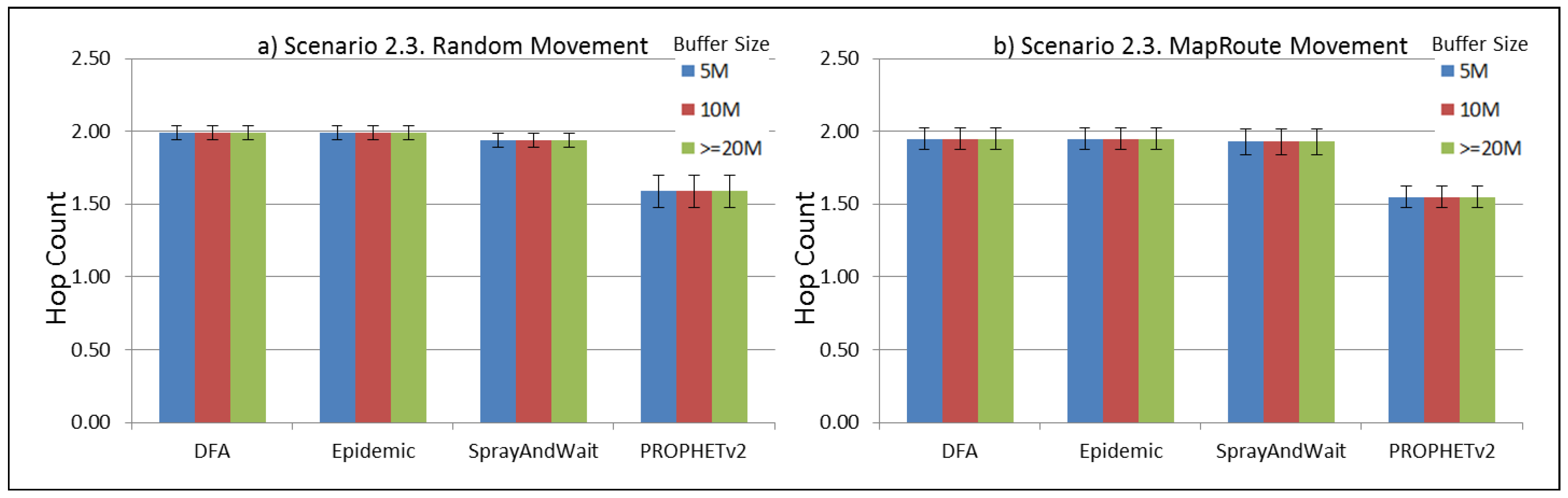 Results for scenario 2.3. Average hop count with different Buffer Sizes, generating 2 kB messages every 1 to 2 h, (a) MAPs moving randomly on the path; (b) MAPs following the path in only one direction. DFA: Distributed Forwarding Algorithm.