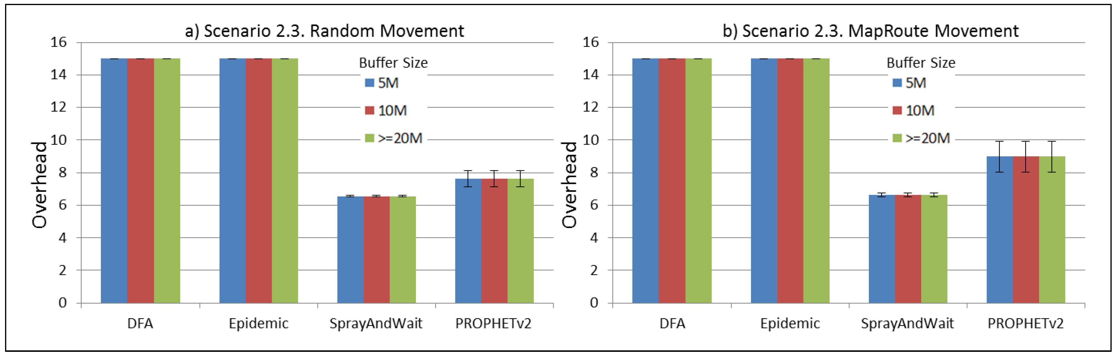 Results for scenario 2.3. Average overhead with different Buffer Sizes, generating 2 kB messages every 1 to 2 h, (a) MAPs moving randomly on the path; (b) MAPs following the path in only one direction. DFA: Distributed Forwarding Algorithm.