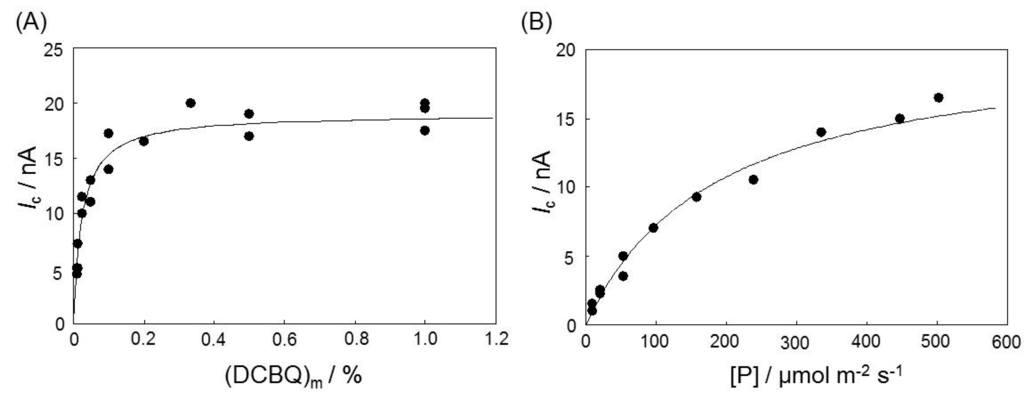 Ic also was plotted as a function of [P], as shown in Figure 2B, and this relationship also appeared to follow Michaelis-Menten-like kinetics with respect to [P]. The (DCBQ)m was 0.5%. By substituting (DCBQ)m and KM for [P] and the apparent Michaelis constant for [P] (KL), respectively, in Equation (2), the Imax and KL values were determined as 19.2 nA and 180.3 μmol·m−2·s−1, respectively. The curves in Figure 2A,B illustrate the results of the regression analyses. Based on the results described above, all experiments in the present work were carried out at a (DCBQ)m of 0.5% and [P] of 500 μmol·m−2·s−1.