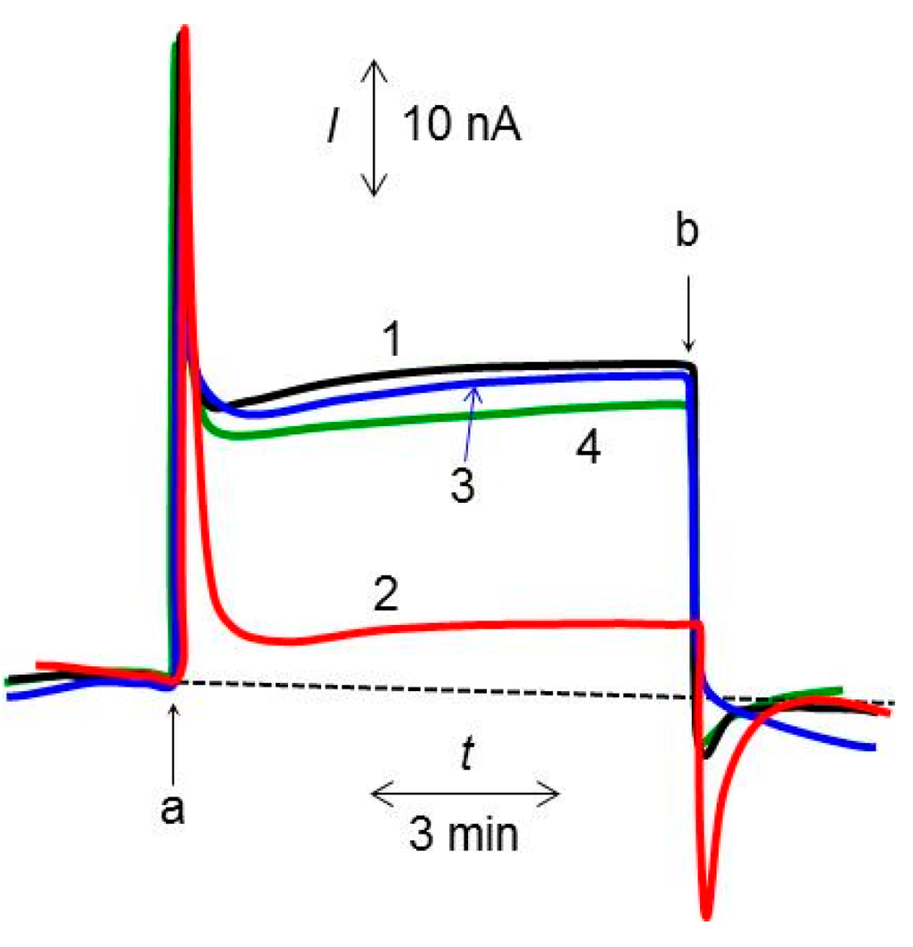 Time-course of the amperometric response measured using a R. sph.-DCBQ-CPE in the absence (curve 1) or presence of 5 μM of KCN (curve 2), 100 μM of phenol (curve 3) and 20 μM of terbutryn (curve 4). Light illumination was applied between points “a” and “b.”
