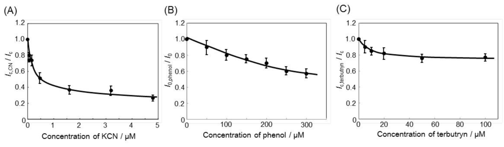 The ratio of the Ic value obtained with CN− to that obtained without CN−, Ic,CN/Ic, was plotted as a function of the concentration of CN− added to the buffer (Figure 4A). The Ic,CN/Ic decreased to ca. 0.8 at a CN− concentration of 0.01 μM and to ca. 0.3 at CN− concentrations over 1.5 μM. With respect to limits for cyanide in drinking water, the World Health Organization suggests a guideline value of 0.07 mg·L−1 [32], which is detectable using the R. sph.-DCBQ-CPE system. Given that the detection limits of CN− biosensors have been reported to be in the range 0.01–10 μM [33], the R. sph.-DCBQ-CPE system could be used for environmental detection of CN−.