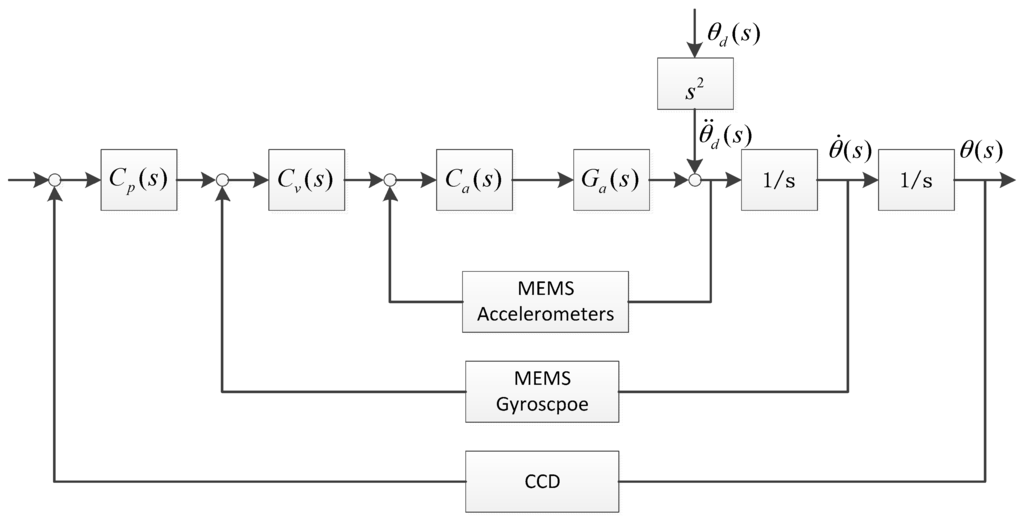 Where Ga(s) is the acceleration open loop transfer function, Ca(s) is the acceleration controller, Cv(s) is the velocity controller, Cp(s) is the position controller, is the angular velocity output, is the disturbance angle and is the disturbance acceleration.