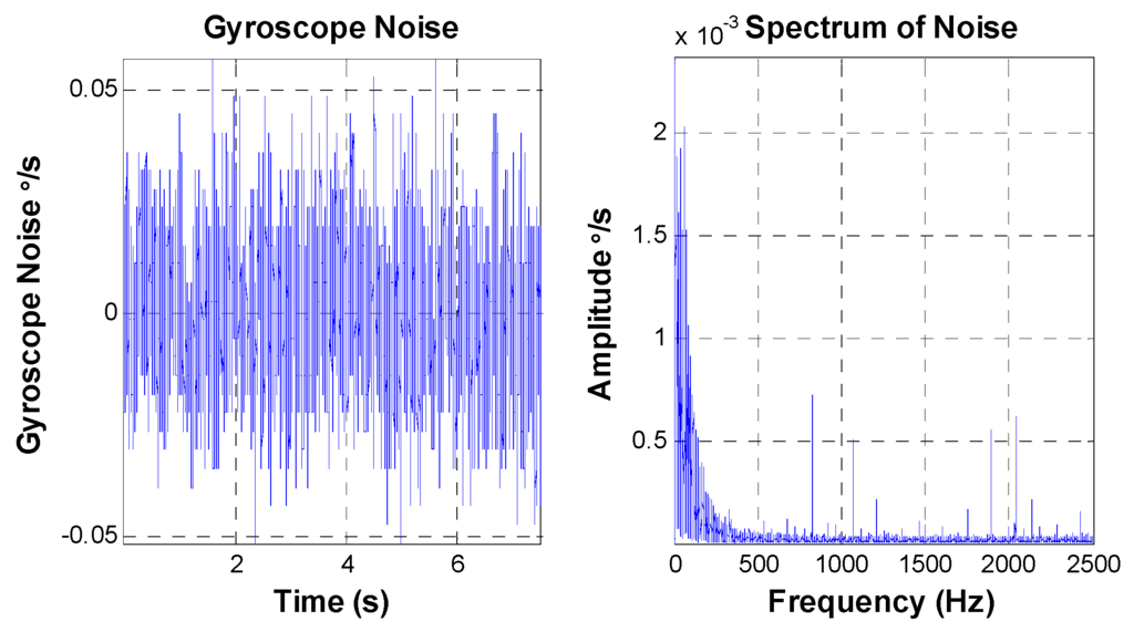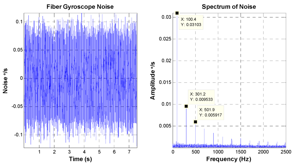 The peak value of the FOG noise is equal to 0.25 °/s, and the RMS value is about 0.037 °/s. Aside from some “spikes”, the amplitude value of amplitude-frequency curve is smooth. The bandwidth of the MEMS gyroscope for the latter experiment is less than 100 Hz, which is lower than that of the FOG. Figure 7 shows the characteristics of the MEMS gyroscope noise.