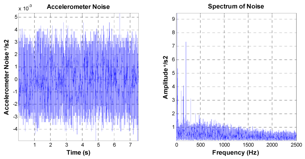 The practical bandwidth of the MEMS accelerometer is about 1000 Hz, which is higher than that of the FOG. The characteristics of the noise are shown in Figure 8.