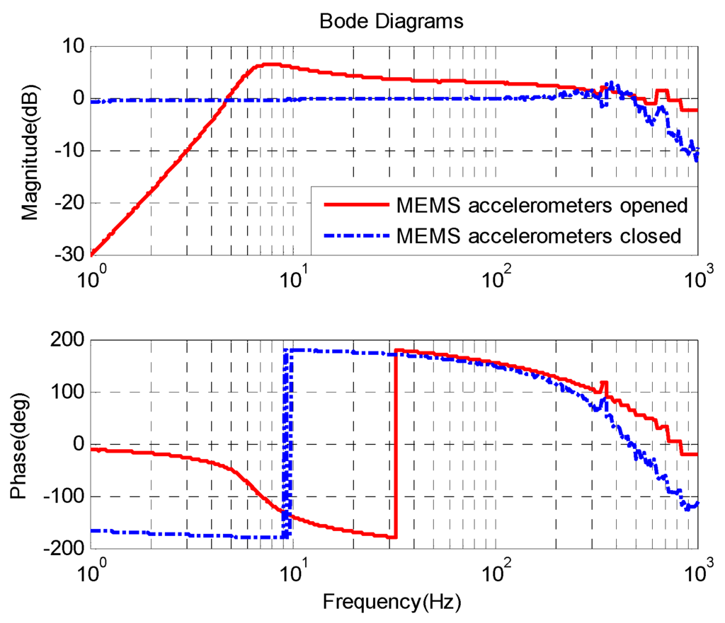 From Equation (5), the open loop acceleration characteristic of the FSM at low frequency is similar to a second-order integrator. Figure 10 shows the open loop and the closed-loop acceleration response. The acceleration closed-loop bandwidth exceeds 700 Hz and the closed-loop acceleration response includes a little differential effect at low frequency which is depicted in Equation (9). The static acceleration noise of AFC is about 0.0028 °/s2, which is about twice than the noise of MEMS accelerometers.