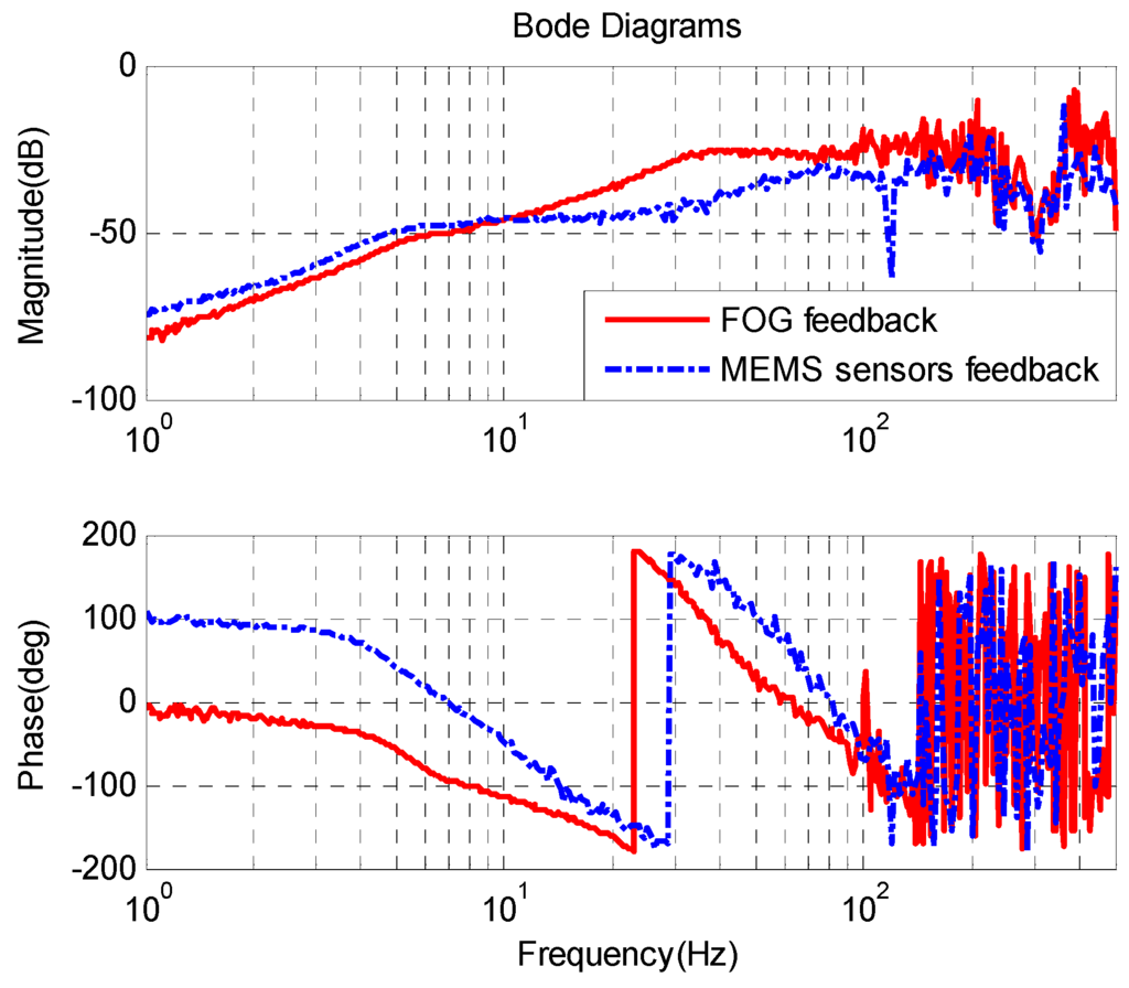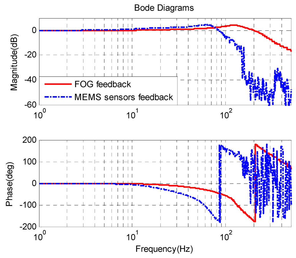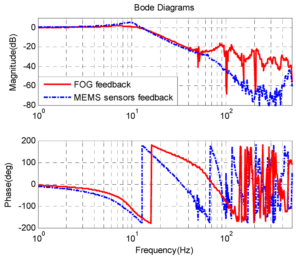 The closed-loop bandwidth of the single FOG velocity loop is about 220 Hz in Figure 11, which is higher than that of the MEMS gyroscope velocity loop with MEMS accelerometer feedback. Therefore, the lower bandwidth will produce some adverse effect on the outer position loop. The static noise of the single FOG velocity loop is about 0.05 °/s, which is larger than that of the MEMS velocity loop with AFC. This is due to the different bandwidth of these sensors.