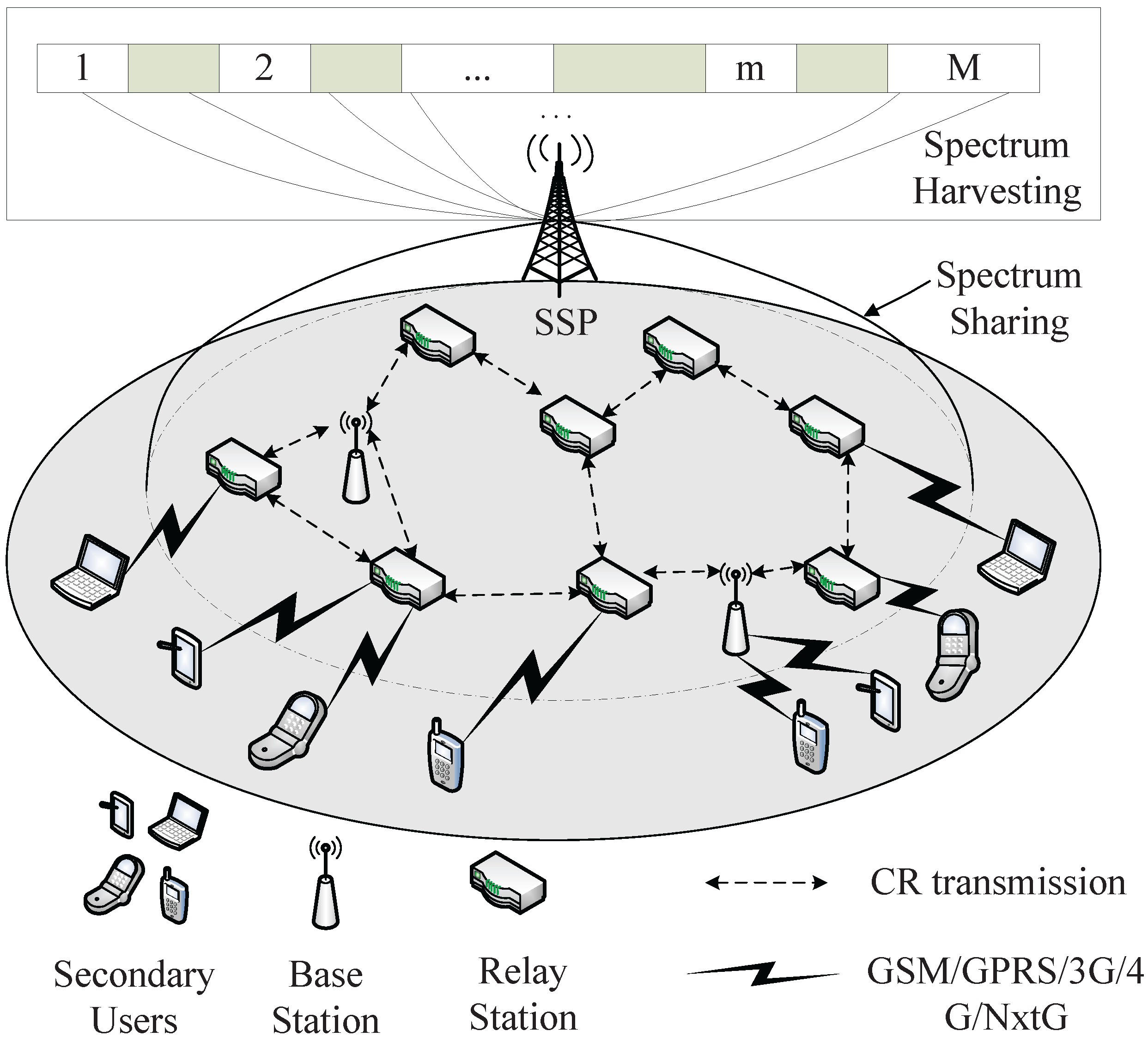 Existing architectures for CRAHNs assume that all SUs are equipped with CRs and sense available spectrum by themselves [12,13,14]. However, a large amount of time and effort have to be spent on development of CR [15,16,17,18]. In addition, there is no reason to enforce SUs to replace their device. Furthermore, CR will increase energy cost for its cognitive functionality [19,20,21,22,23]. The energy cost for cognitive functionality is undesirable for the battery powered devices [24,25,26,27,28,29,30,31].