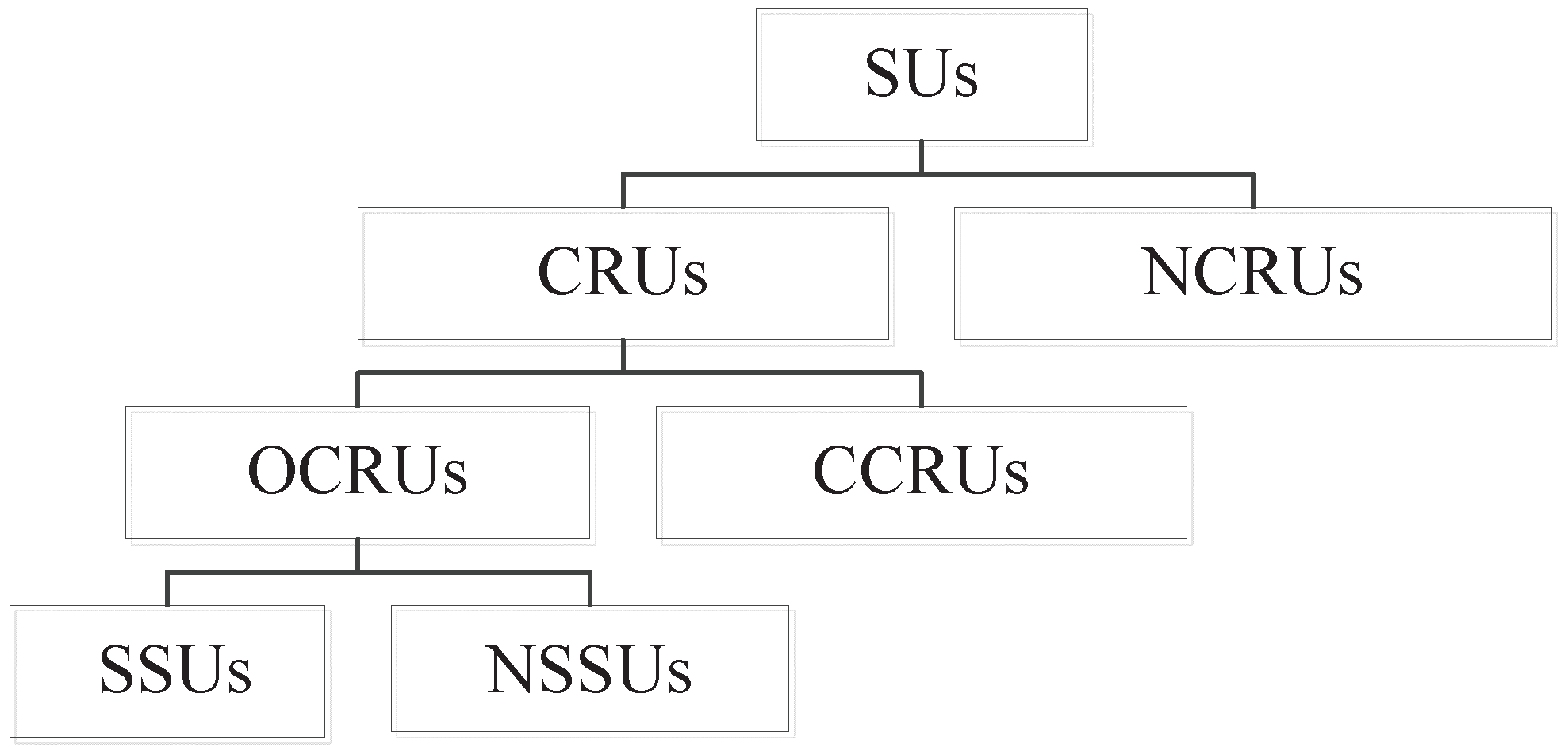 The relationship between different types of SUs can be summarized as follows: SUs are classified into CRUs and NCRUs. CRUs are classified into OCRUs and CCRUs. OCRUs are classified into SSUs and NSSUs. Figure 2 shows the relationship between different types of SUs in RCRAHNs.