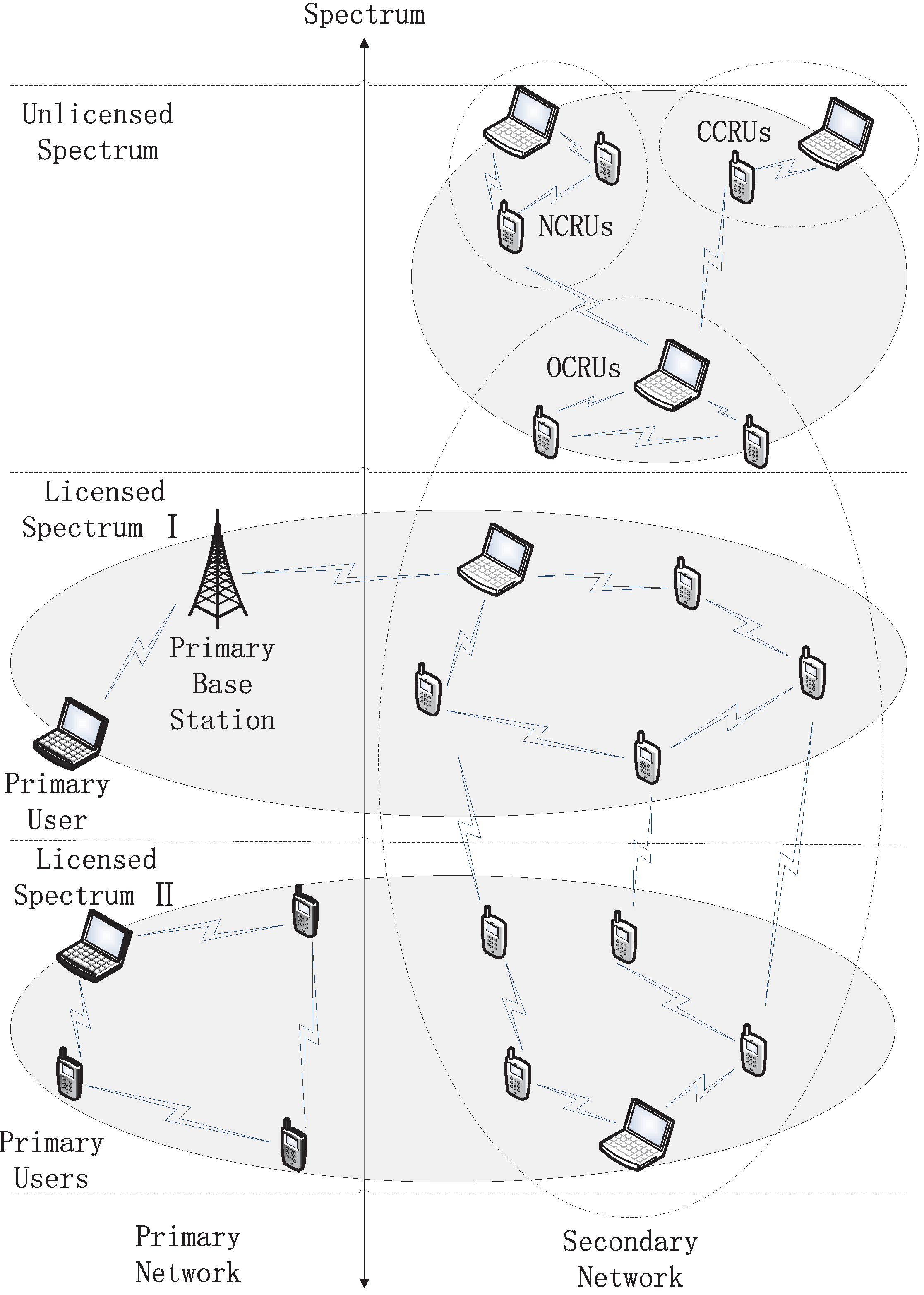 Figure 3 shows the system architecture of RCRAHNs. As shown in Figure 3, SUs mainly consist of three types, which are OCRUs, CCRUs and NCRUs, respectively. SSUs and NSSUs are included in OCRUs. Both NCRUs and CCRUs are only allowed to use unlicensed spectrum. OCRUs are allowed to use both unlicensed and licensed spectrum. PUs still use licensed spectrum to transmit data.