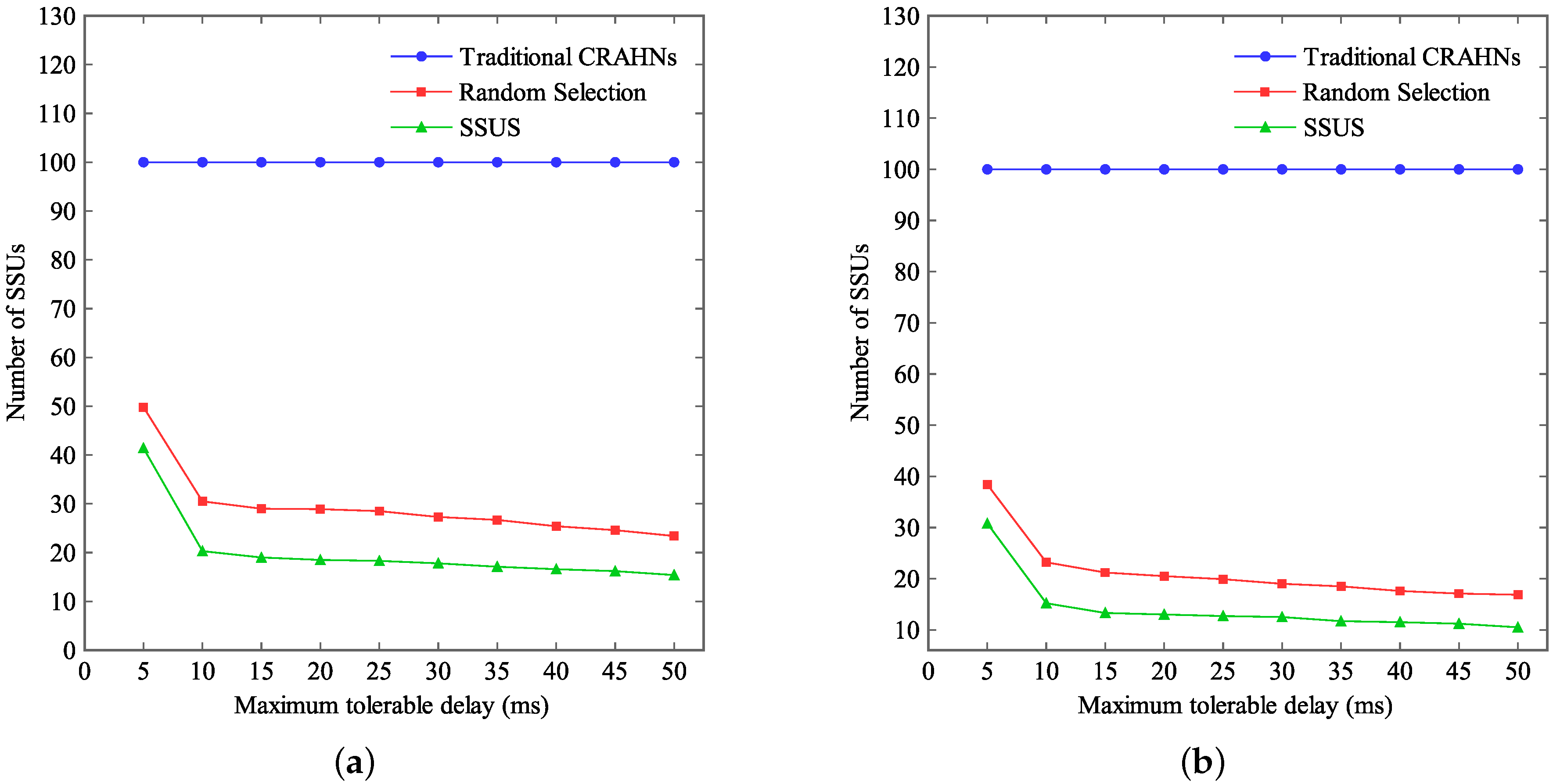 Figure 5 reports the number of SSUs when the maximum tolerable delay varies. In this study, the communication range of SUs is fixed at 15 m. The network size is fixed at m and m, respectively. Simulation results in Figure 5a are simulated under the network size of m. Simulation results in Figure 5b are simulated under the network size of m. varies from 0 ms to 50 ms.