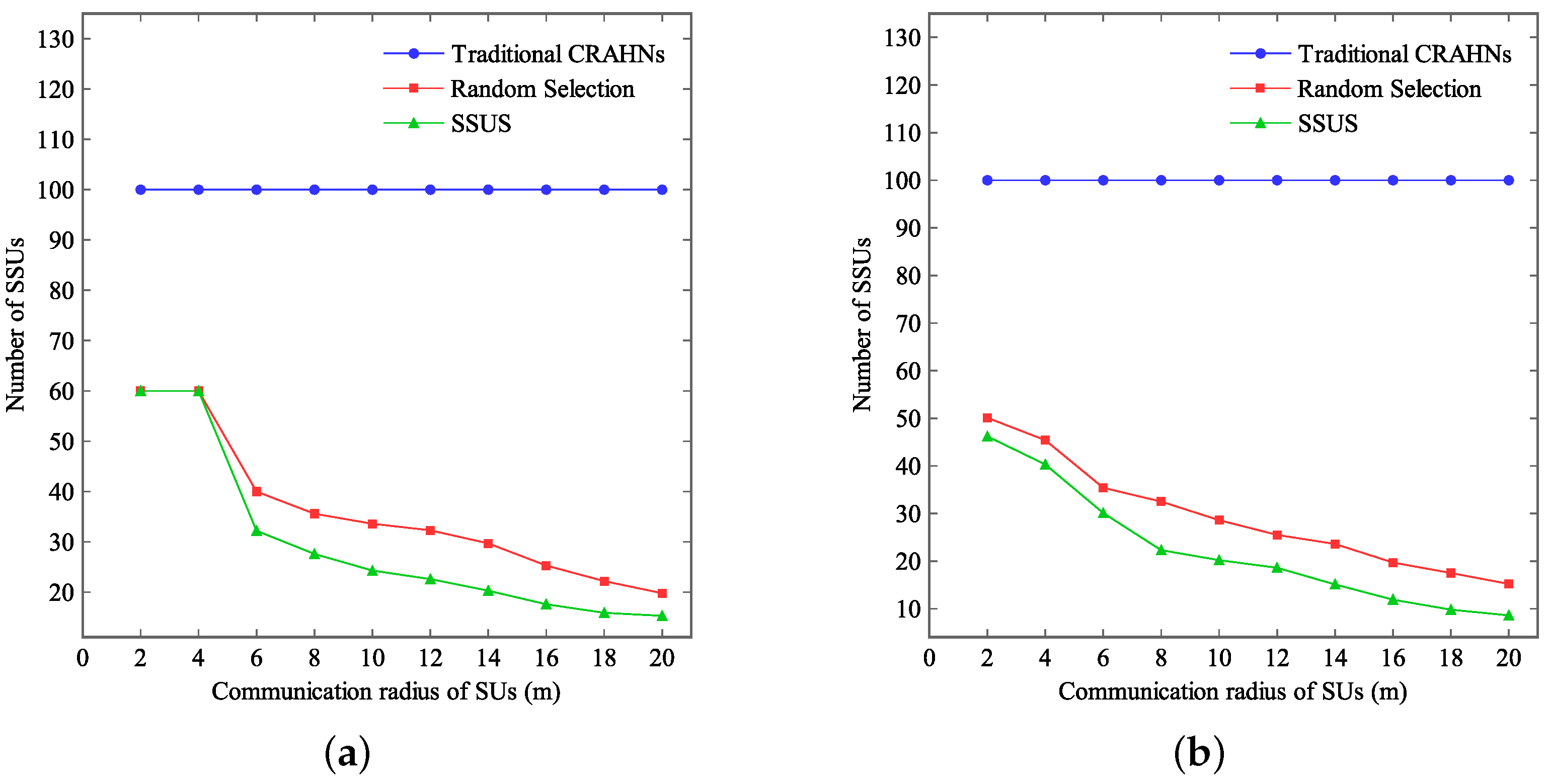Figure 6 presents the number of SSUs when the communication range (i.e., communication radius) of SUs varies. In this study, the maximum tolerable delay is fixed at 25 ms. The network size is fixed at m and m, respectively. Simulation results in Figure 6a are simulated under the network size of m. Simulation results in Figure 6b are simulated under the network size of m. The communication range of SUs varies from 0 m to 20 m.
