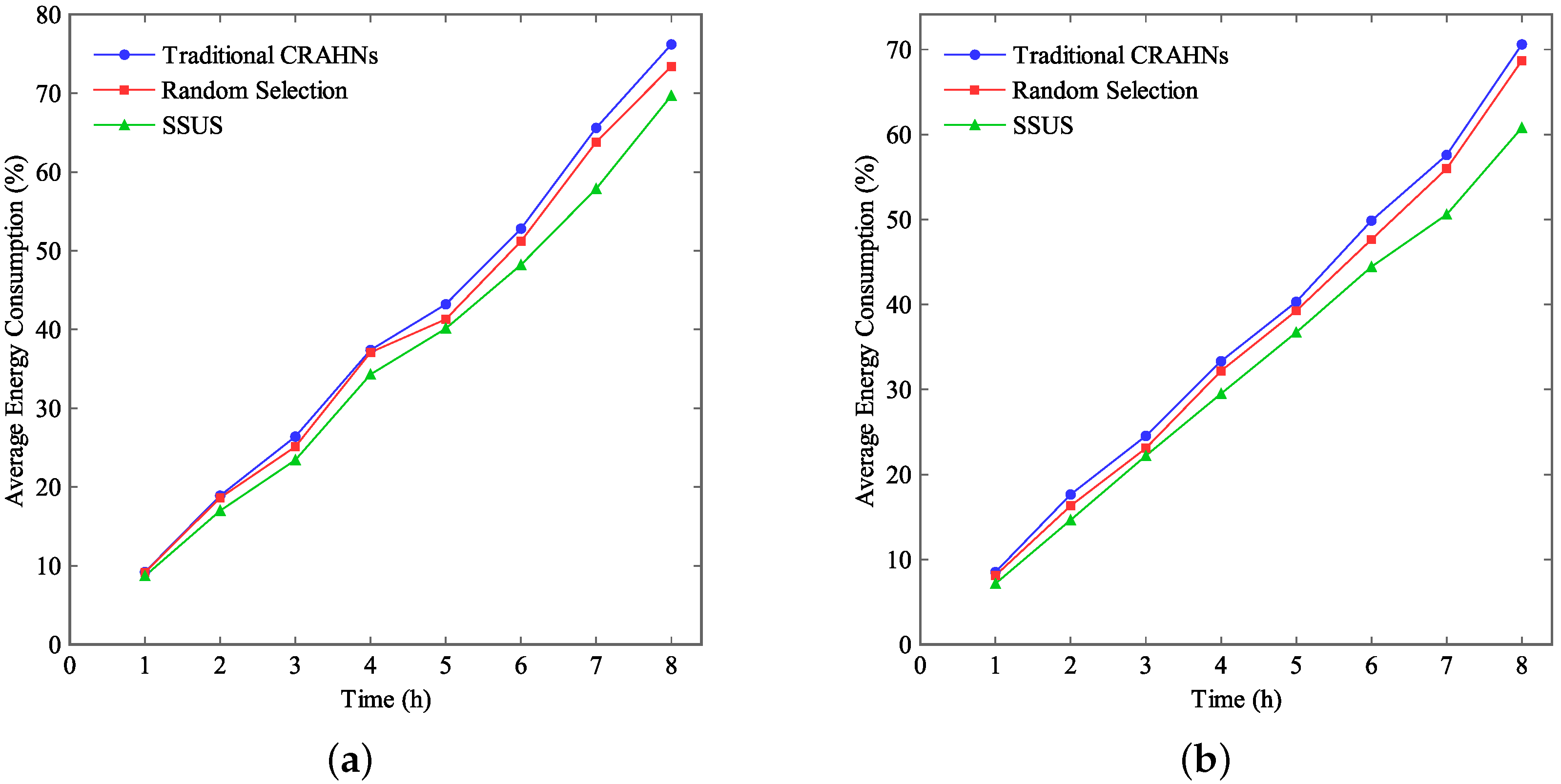 Figure 7 demonstrates the average energy consumption when the simulation time varies. Define the average energy consumption as the ratio between the energy consumption of all SUs and the total energy of all SUs. In this study, the maximum tolerable delay and the communication range of SUs are fixed at 25 ms and 15 m, respectively. The network size is fixed at m and m, respectively. Simulation results in Figure 7a are simulated under the network size of m. Simulation results in Figure 7b are simulated under the network size of m.