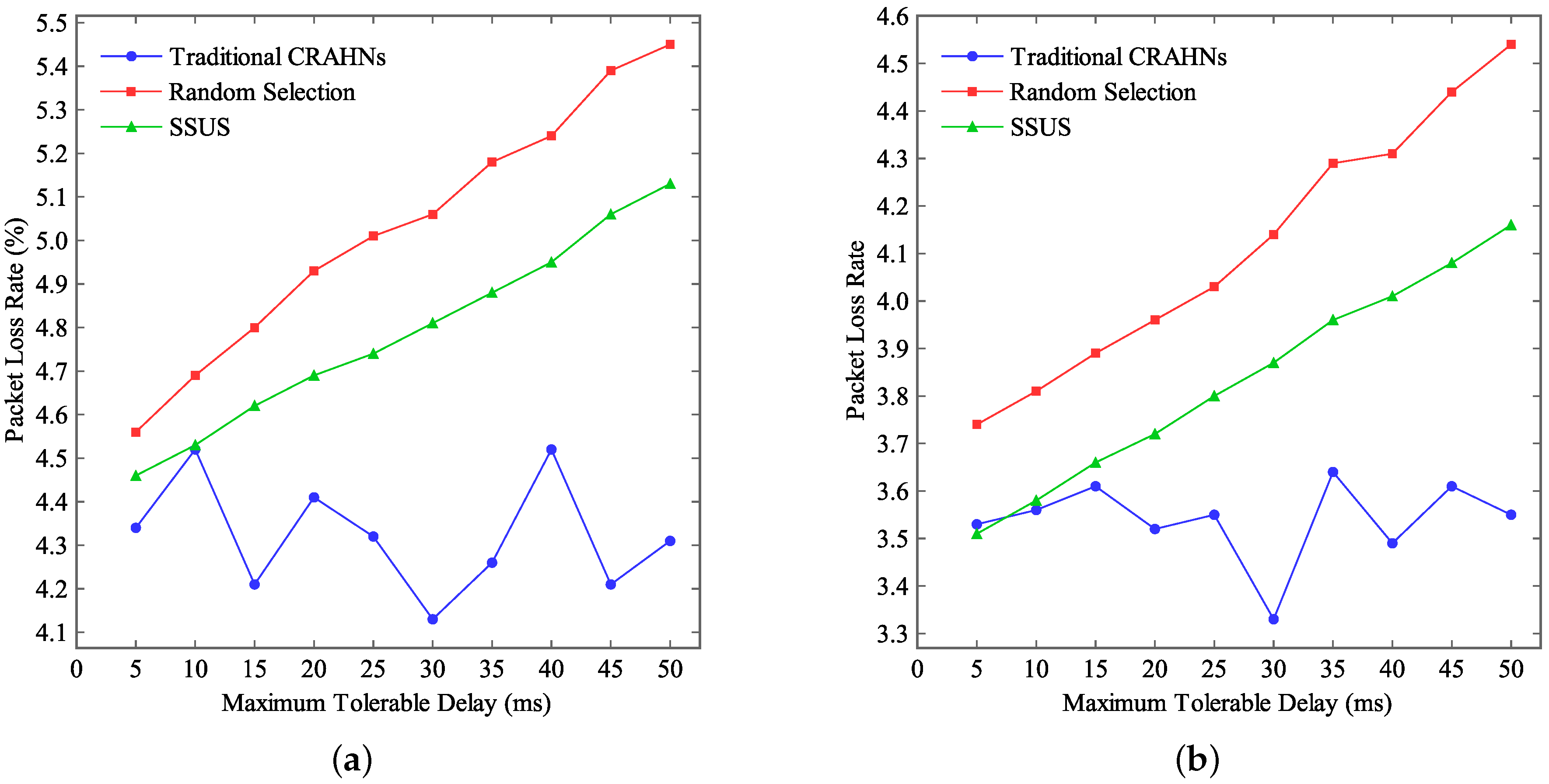 Figure 8 shows the packet loss rate when the maximum tolerable delay varies. Define the packet loss rate as the ratio between the number of the lost packets and the total packets. In this study, the communication range of SUs is fixed at 15 m. The network size is fixed at m and m, respectively. Simulation results in Figure 8a are simulated under the network size of m. Simulation results in Figure 8b are simulated under the network size of m. The maximum tolerable delay varies from 0 ms to 50 ms.
