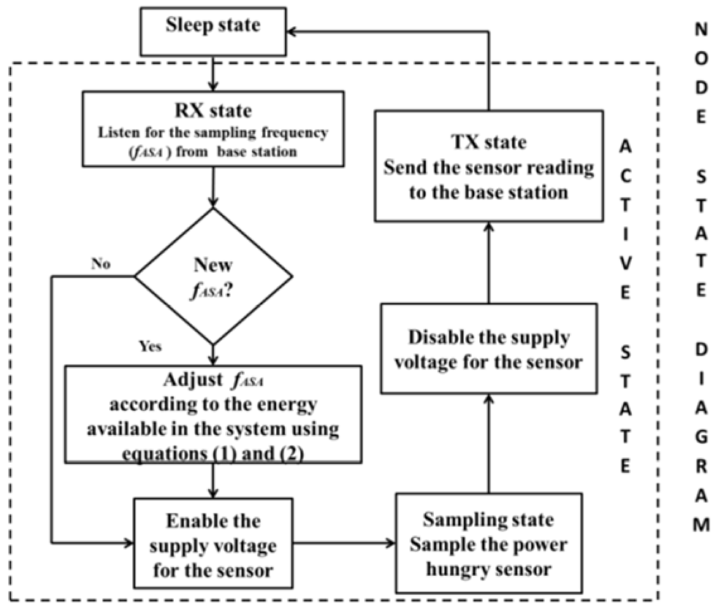 In the state machine in Figure 1, we assume a duty cycled node which has harvesting capabilities and a power hungry sensor. When the node samples the sensor it also sends the measurement to the BS. We assume that the earlier described ASA is running on the BS. When the ASA detects a change in the frequency of the signal, the base station sends a new sampling frequency, fASA, to the node. The node, which has information on how much energy is available in its battery (and how much energy is harvested), adapts this sampling frequency fASA (received from the BS) according to Equations (1) and (2) resulting in a new sampling rate fEASA.