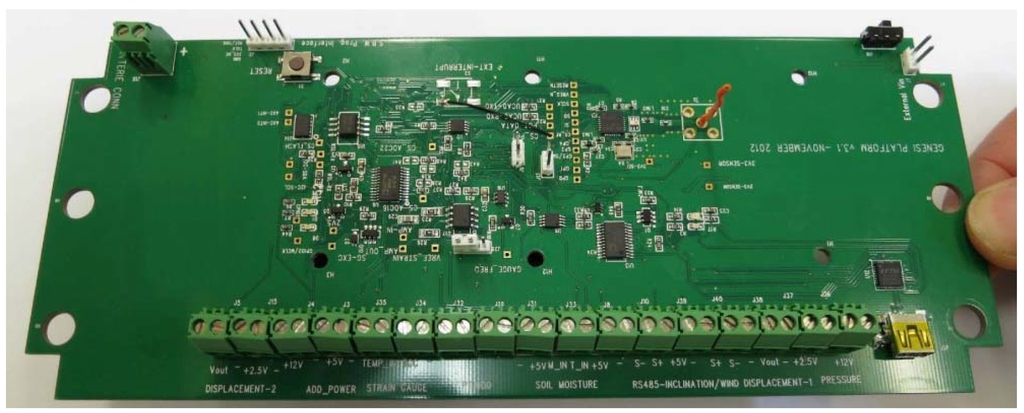 The custom made platform used in deployment (I) (Figure 3) is capable of supporting a variety of digital and analog sensors intended for structural health monitoring including the previously mentioned ultrasonic wind speed and direction (WMT52) sensor. The node uses the Texas Instruments MSP430F5437A microcontroller and the CC2520 as radio transceiver. The selected microcontroller has a 16 bit RISC CPU and offers various sleep modes with low power consumption. It also has sufficient SRAM and flash memory to accommodate the requirements of the application. The CC2520 exhibits fast wake-up times, low power consumption (two different sleep modes), and compliance with the updated IEEE802.15.4-2006 Standard.