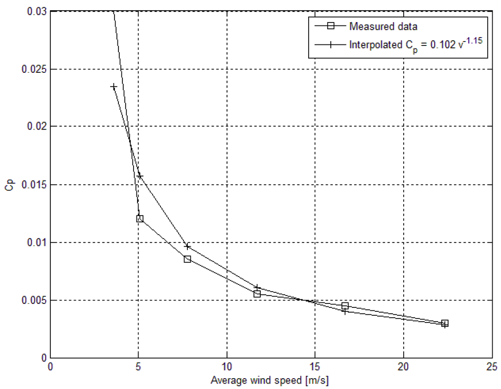 where A is the swept area of the blades, ρ is the density of air, η is the efficiency of the rectifier and the DC-DC converter, vavg is the measured average wind speed and cp is the power coefficient, which is a function of the tip-speed ratio (TSR) of the wind turbine [34]. cp is determined using both analytical formulas and measurements in the lab with controlled wind-speed and direction. In general it is less than 0.1 for small size turbines. Because the power factor is a function of the TSR, it is indirectly a function of the wind speed. In that case the cp factor cannot have fixed value and must be corrected for different values of the wind speed. The manufacturers of wind turbines usually give a TSR vs. cp curve. This curve was not available for this work and a characterization of the turbine had to be performed. The characterization was conducted experimentally by measuring the RPM and the power produced at different wind speeds; whereas the power available in the wind, and the power factor were calculated using Equations (8) and (9).