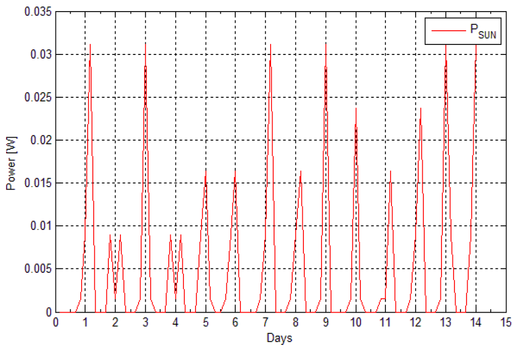 Figure 7 gives the estimated power harvested by the solar panel for the days of deployment (II), derived using Equations (13) and (14). The battery used for both the calculations and the deployment (II) had a capacity of 800 mAh. The solar panel had the following specifications: PMAX = 1.3 W, VMAX = 6.5 V, IMAX = 205 mA and dimensions of 0.111 m × 0.091 m.