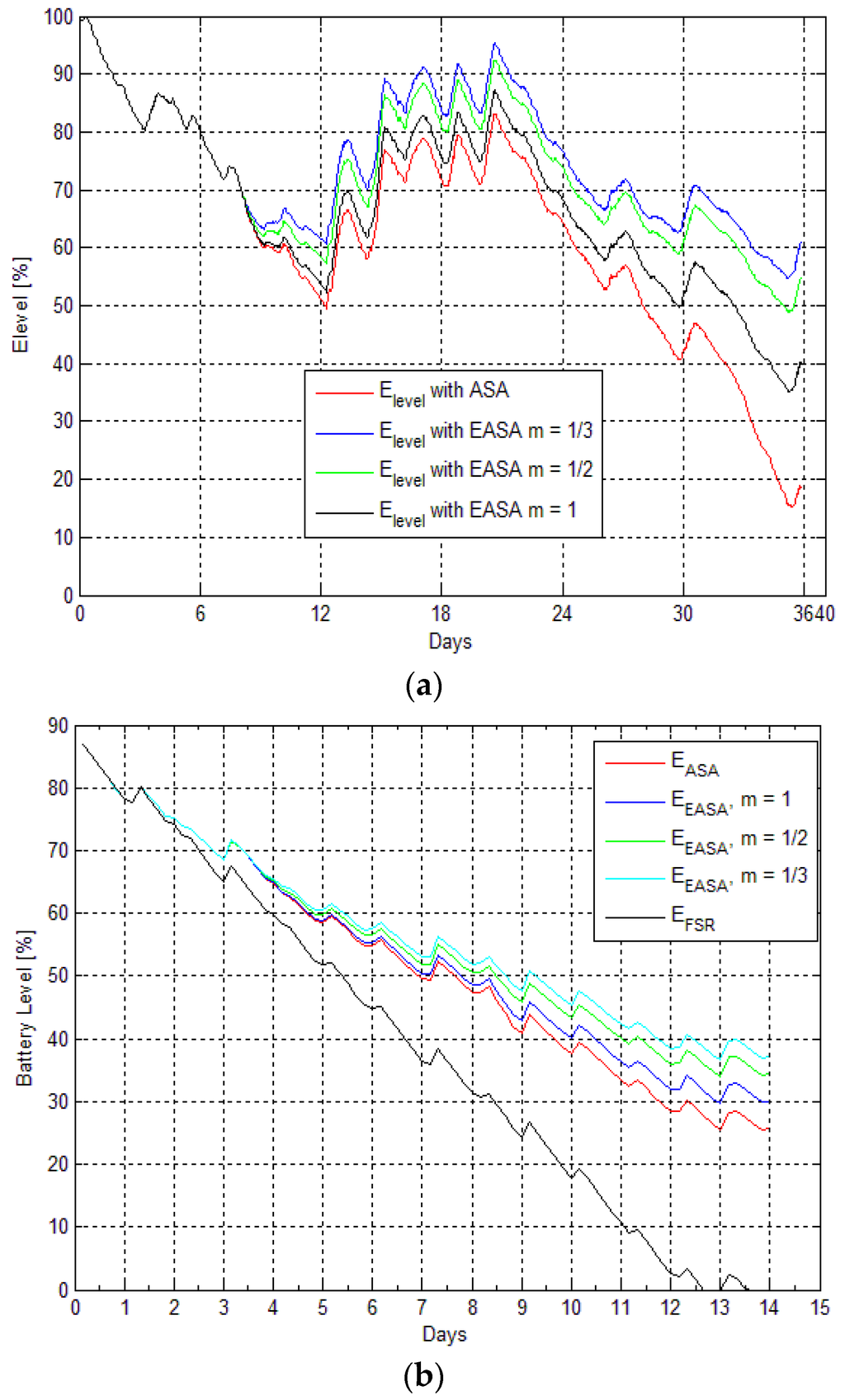 In Figure 9, a comparison of the energy profiles of the nodes is presented. For both deployments (I) and (II), we consider the following cases: (i) the node is using the sampling rate from ASA; and (ii) when the node is adjusting the sampling frequency according to its available energy using Equations (1) and (2) with three different values of the parameter m. For deployment (II), the energy profile of the node with fixed sampling rate EFSR is also presented. In both cases (Figure 9a,b), when the energy level is above the threshold level (Xlevel = 70%), the sampling frequencies (rates) remain the same (fEASA = fASA) and the energy levels are identical, which means that the energy consumed in both cases is same. When the energy level is below Xlevel the sampling frequencies are no longer the same, which is reflected in the energy consumed by the nodes. The node on which EASA is running saves energy by reducing its sampling rate according to the current energy level. If the sampling frequency is not adapted to the energy available in the battery, the energy levels can significantly drop (below 20% in (Figure 9a) and to 0% in (Figure 9b)). In both of the figures, the same trend is present where the node running the ASA and the node using the EASA have identical energy levels until the critical level Xlevel is reached. In this figure the difference between the energy levels of node sampling the sensors with fixed sampling rate (FSR) and harvesting energy from only one source (i.e., sun in this case) can be noticed. This confirms that a significant savings can be achieved using the EASA, in comparison with using a fixed sampling rate strategy.