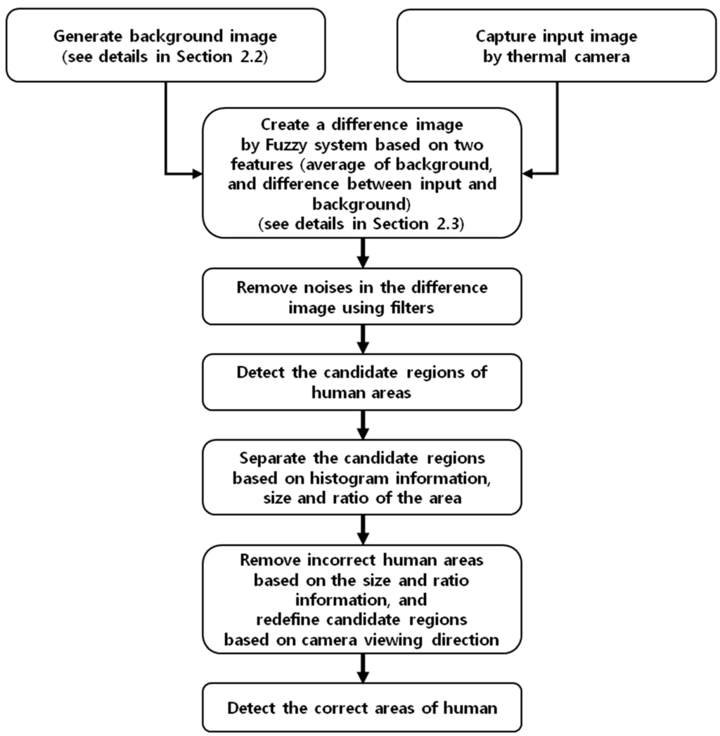 An overview of the proposed method is presented in Figure 1. We propose a three step system for detecting humans in a thermal image: generation of a background image (model); obtaining a difference image based on fuzzy system with the background and input image; and detection of humans in the difference image. In this paper, the image obtained in the sub-bands of medium-wave IR (MWIR, 3–8 μm) and long-wave IR (LWIR, 8–15 μm) is called a thermal image [38].