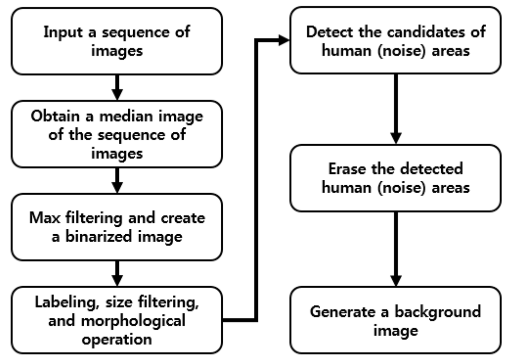 Finally, a correct background image is created. Although motionless humans are located at the same position in all of the frames, all non-background areas (human areas) are erased and a correct image is generated. In this study, we used fifteen kinds of databases. More detailed experimental results with these databases are presented in Section 3.1. One example of the generated background image is provided in Figure 3d, where there are no human areas in the final background image.