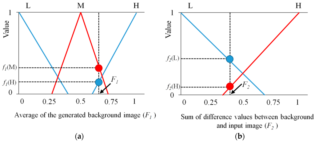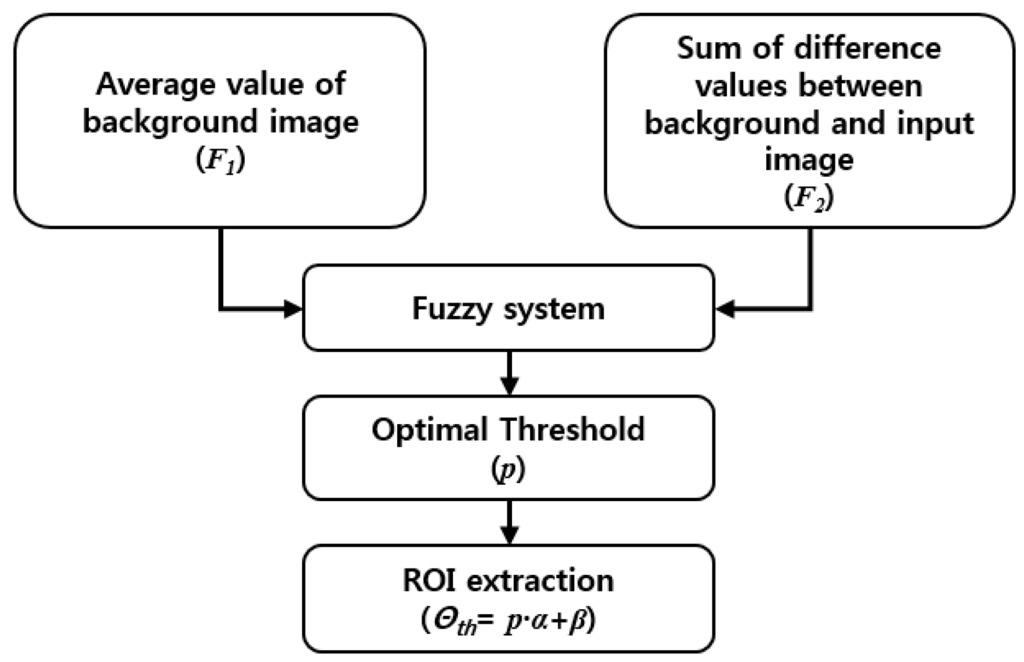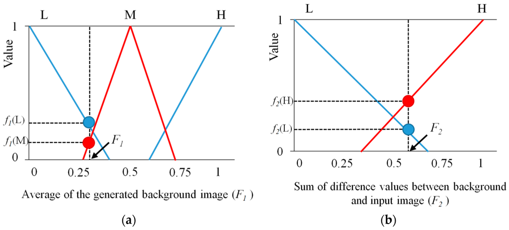 A fuzzy system for the proposed method is illustrated in Figure 6. The characteristics of human areas in thermal images are changed because of temperature and environmental factors. For example, in general, the intensity of humans in thermal images captured at night or during winter is much higher than that of the background. However, if the image is captured at daytime or much high temperature conditions, these intensity conditions are reversed. To consider these conditions, we use two kinds of features for the fuzzy system to extract the correct threshold for obtaining a human candidate area by background subtraction. The average value of the generated background image (F1 of the Equation (5)) and the sum of the difference values between the background and input images (F2 of the Equation (7)) are used as two input features. First, the average value of the generated background image is simply obtained using Equation (5):