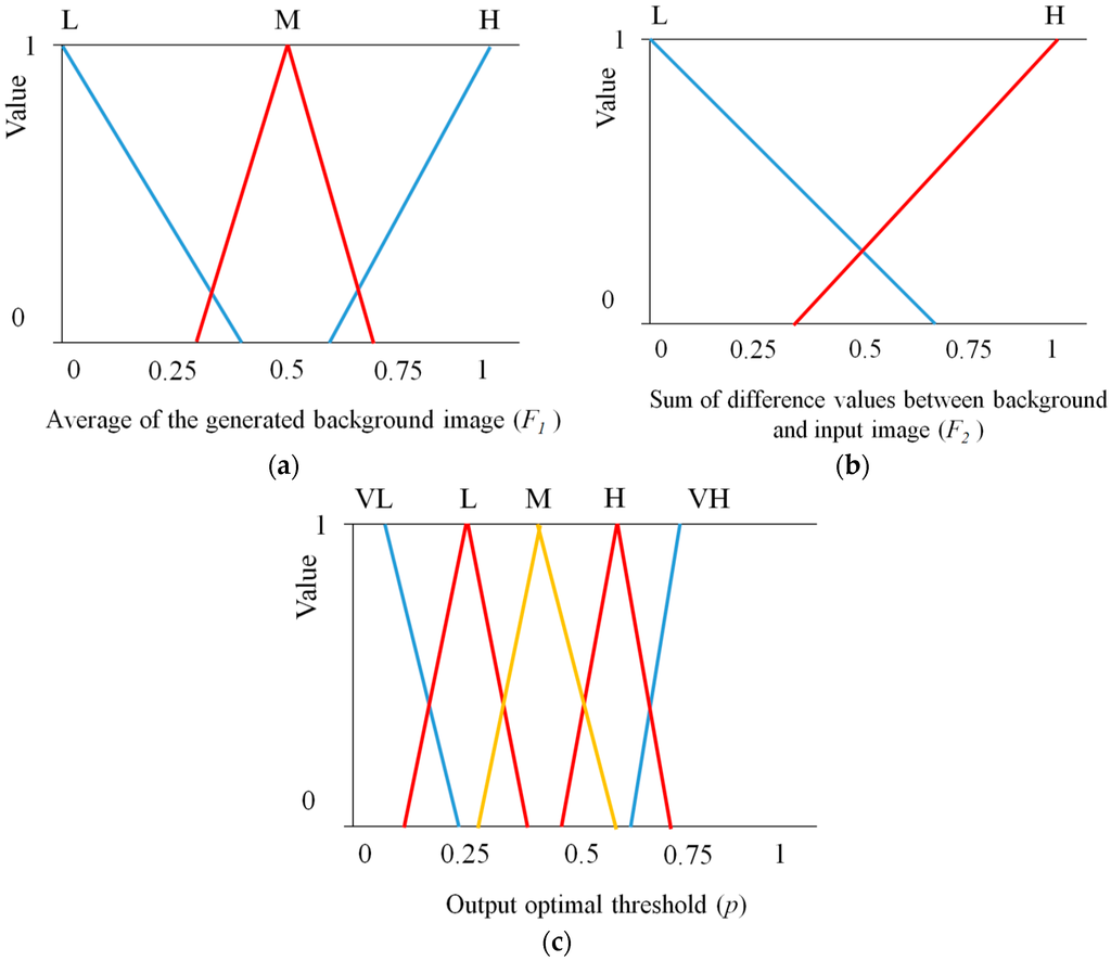For determining an effective threshold for obtaining regions of interest (ROI) which represent a human candidate area, the brightness of a background image is the main concern for the background subtraction technique. If the brightness difference between a human and the background is too small and the threshold for subtraction is too large, it is hard to extract a human area. On the other hand, if the brightness difference is too large and the threshold for subtraction is too small, it is also difficult to define a human area because other neighboring areas can be determined as human areas. Therefore, in order to represent membership functions for the brightness of background images, we use three membership functions for low (L), medium (M), and high (H), as shown in Figure 7a.