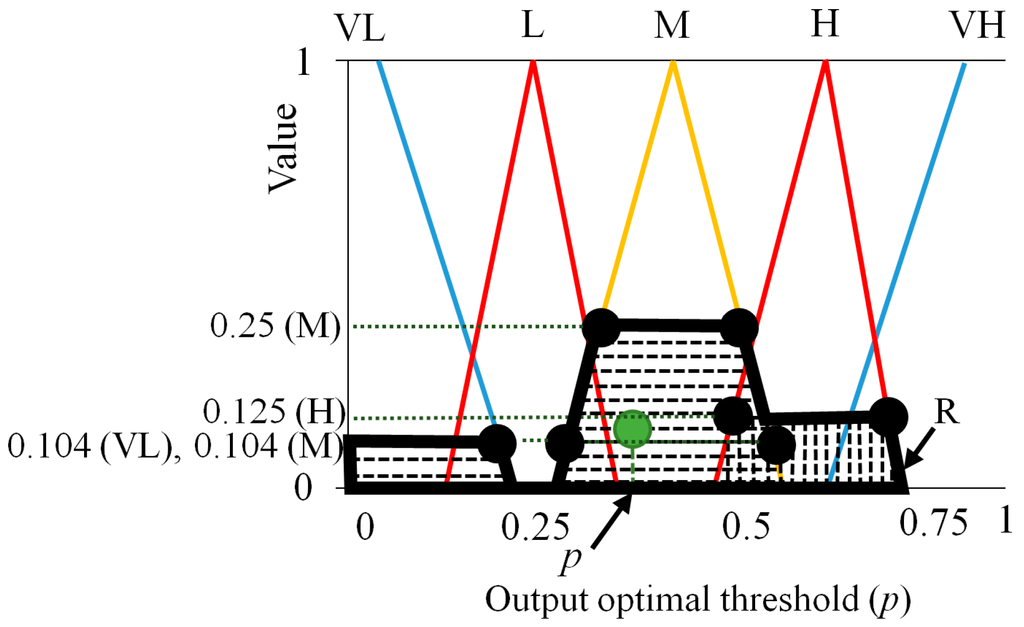 With these four values of (0.25 (M), 0.104 (M), 0.125 (H), 0.104 (VL)), we can define the region (R depicted by bold black lines of Figure 11) for obtaining the fuzzy output value. Based on the COG defuzzification method, the output optimal threshold ( of the Equation (11)) is calculated as the gravity position of the region (R), as illustrated in Figure 11.