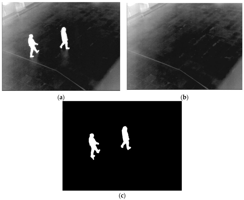 Example of a difference image: (a) input image; (b) background image; (c) difference image.