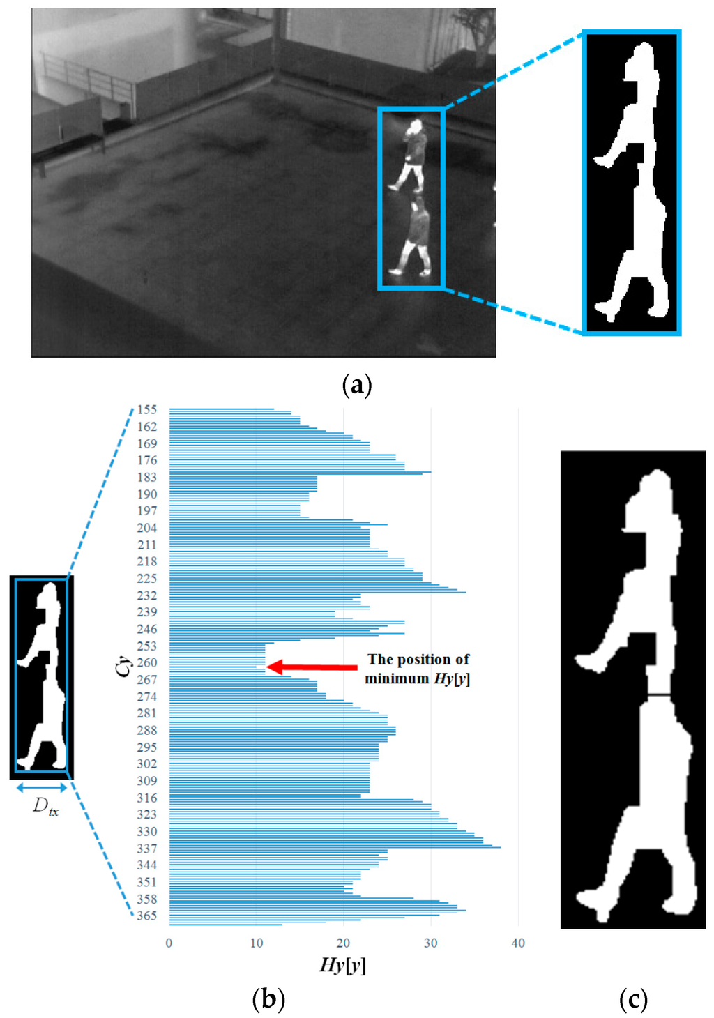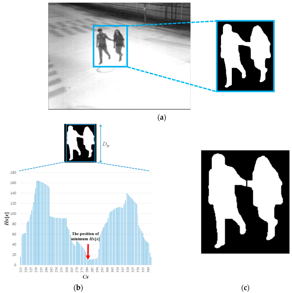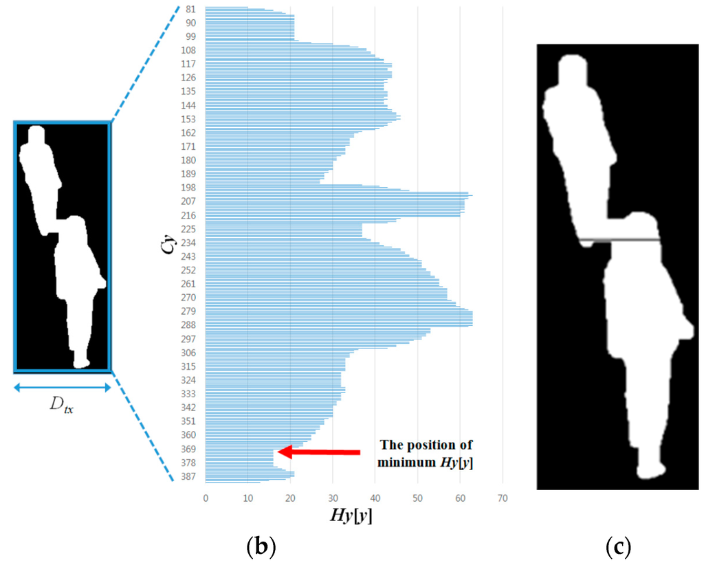 If the minimum value of Hx[x] or Hy[y], which is illustrated in Figure 14b or Figure 15b, is lower than the threshold, the candidate region is divided into two regions at the position, as illustrated in Figure 14c or Figure 15c. However, if two people are located closely in the diagonal direction or overlapped up and down, it is detected as one candidate region, which may not be separated by horizontal or vertical histogram information. As shown in Figure 16b, the minimum value of Hy[y] is higher than a threshold, and Cy, which is the position of the minimum value of Hy[y], is not located near the middle position of the candidate region, even though the region includes two people. In this case, if the conditions of the Equation (15) are satisfied, the candidate region is separated as two parts horizontally at the middle position of the candidate region as illustrated in Figure 16c, else the candidate region is not separated: