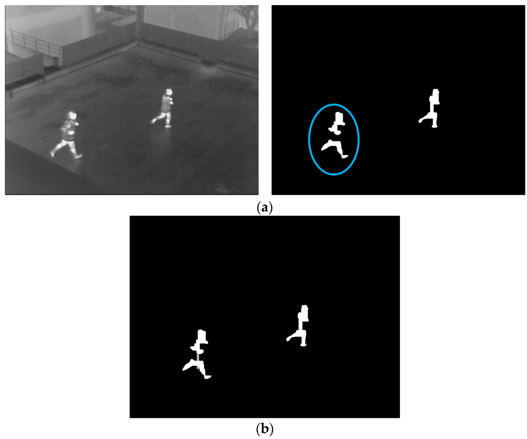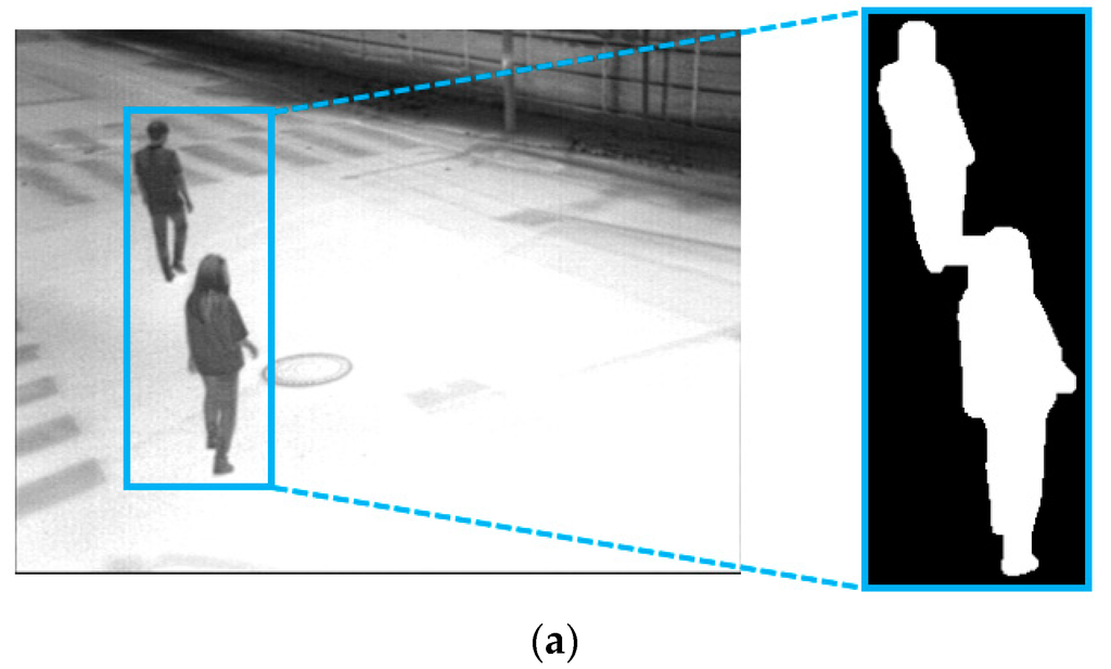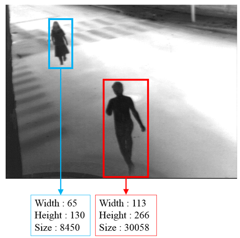 With the recent development of computer vision and pattern recognition technologies, human detection has been used in various applications, including intelligent surveillance systems [1,2,3,4,5,6,7,8,9]. Because of its various advantages of being less affected by poor conditions like illumination changes, low light, and fog, etc., human detection by thermal cameras has been highlighted. The gray level value of an object in a thermal image is determined by the temperature of the object. Generally, humans in an image are warmer than the background, so the gray level of a human’s area is usually higher than that of the surrounding environment. However, the properties of these areas can be affected by the temperature or environmental conditions. The condition that a human area is brighter than the surrounding areas in a thermal image is typically satisfied during night and winter, but in summer, the condition is changed, and the brightness of a human image is darker than the background during summer or on a hot day. These factors can affect the accuracy of detecting human areas in thermal images [9,10,11,12,13,14,15,16,17,18,19] and make it difficult to distinguish human areas from the background in the image.