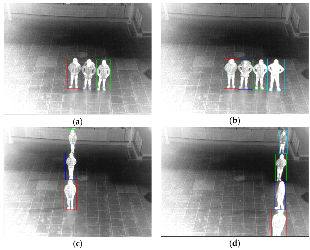 Our novel ideas in this Section are to segment two people with occlusion in diagonal direction (Figure 16) and handle with the cases of three or more people in the similar place with occlusion (Figure 17). All the parameters used in the method of dividing the detected box were experimentally determined with the images (which were not used for all the experiments of performance measurements shown in Section 3) in advance. With these images, the ground-truth areas of human were manually depicted. In addition, according to various parameters, the human areas could be automatically detected. With the ground-truth and automatically detected areas, we can calculate the PPV, Sensitivity, and F1-score of the Equations (17)–(19). Optimal parameters were determined, with which the highest PPV, Sensitivity, and F-score of human detection were obtained. In addition, the same parameters were used for all the experiments in Section 3.