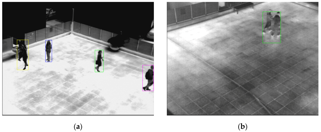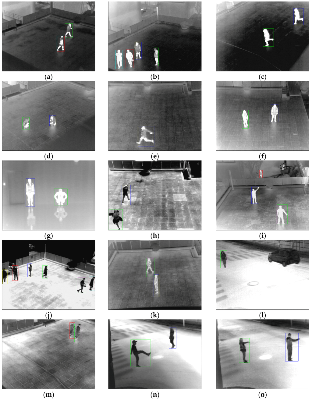 In Figure 25, the detection results of the proposed method are presented. The square box indicates the detected region of a human. Despite the fact that there are humans located closely (and with a little overlap) (Figure 25a,b,j,k,m), various types of human areas, such as human areas darker than the background (Figure 25h,j,l–o), vehicles (Figure 25l), similar intensities between humans and the background (Figure 25d,k,m), and various types of human behavior, such as walking, running, sitting, standing, waving, punching, and kicking (Figure 25a–o), are detected correctly. As shown in Figure 25, complex scene does not affect the human detection because the image by thermal camera is not changed according to the complexity of scene but the temperature of the scene.