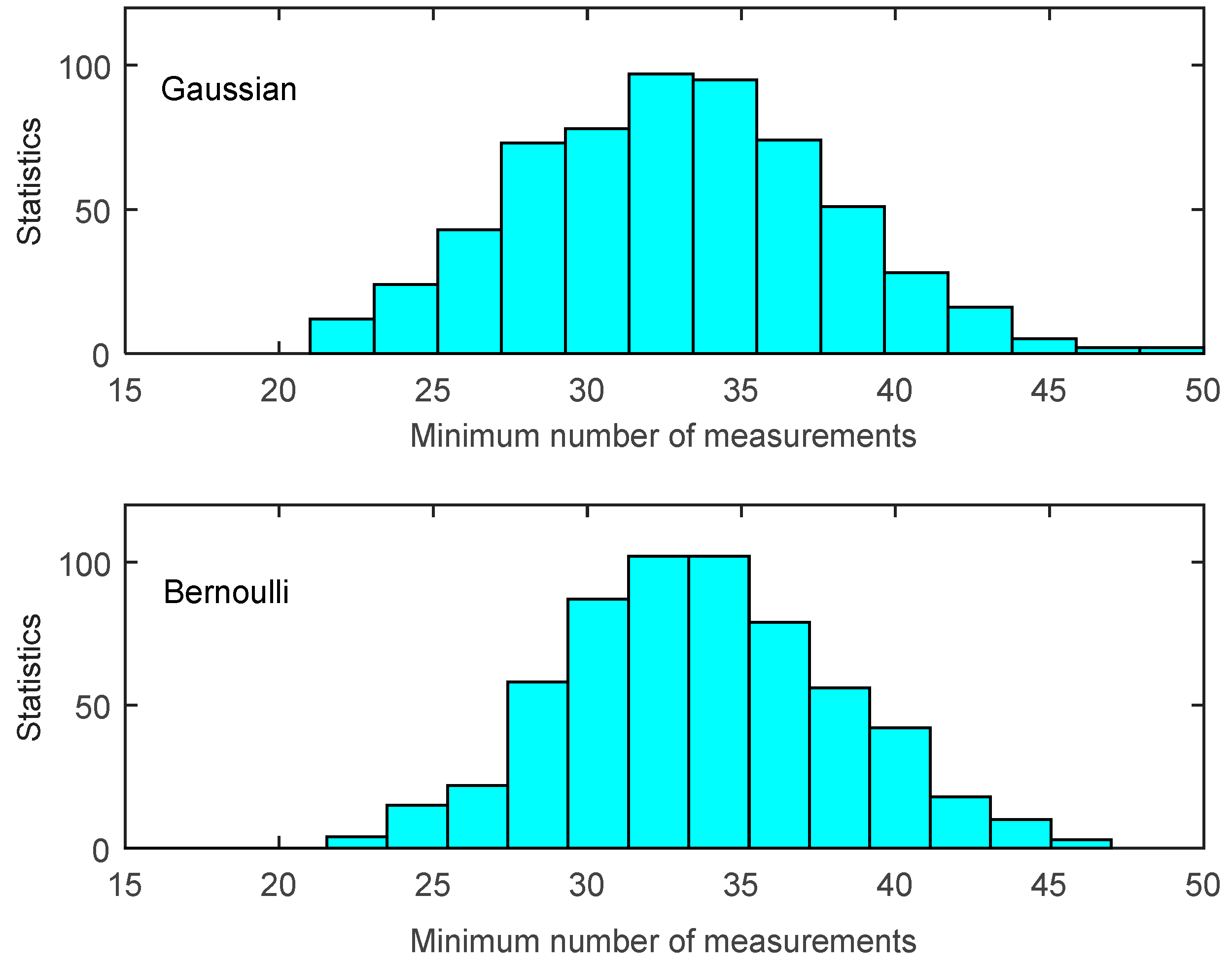The experimental results are depicted in Figure 3. We can conclude that both measurement ensembles exhibit high variance (mean values are 32.9450 and 33.8167, respectively; standard deviations are 4.8468 and 4.9414, respectively) and the most minimum number of required measurements are lower than the upper bound (50). This explains that schemes relying on an upper bound can guarantee successful data recovery, but it often means that many unnecessary measurements are taken (in our experiment 17.5 and 16.18 of 50 on average). For CDG applications, as shown in Figure 2, the formation of each measurement result requires processing and forwarding through several intermediate nodes; thus, reducing the unnecessary measurements will definitely decrease nodes' energy consumption.