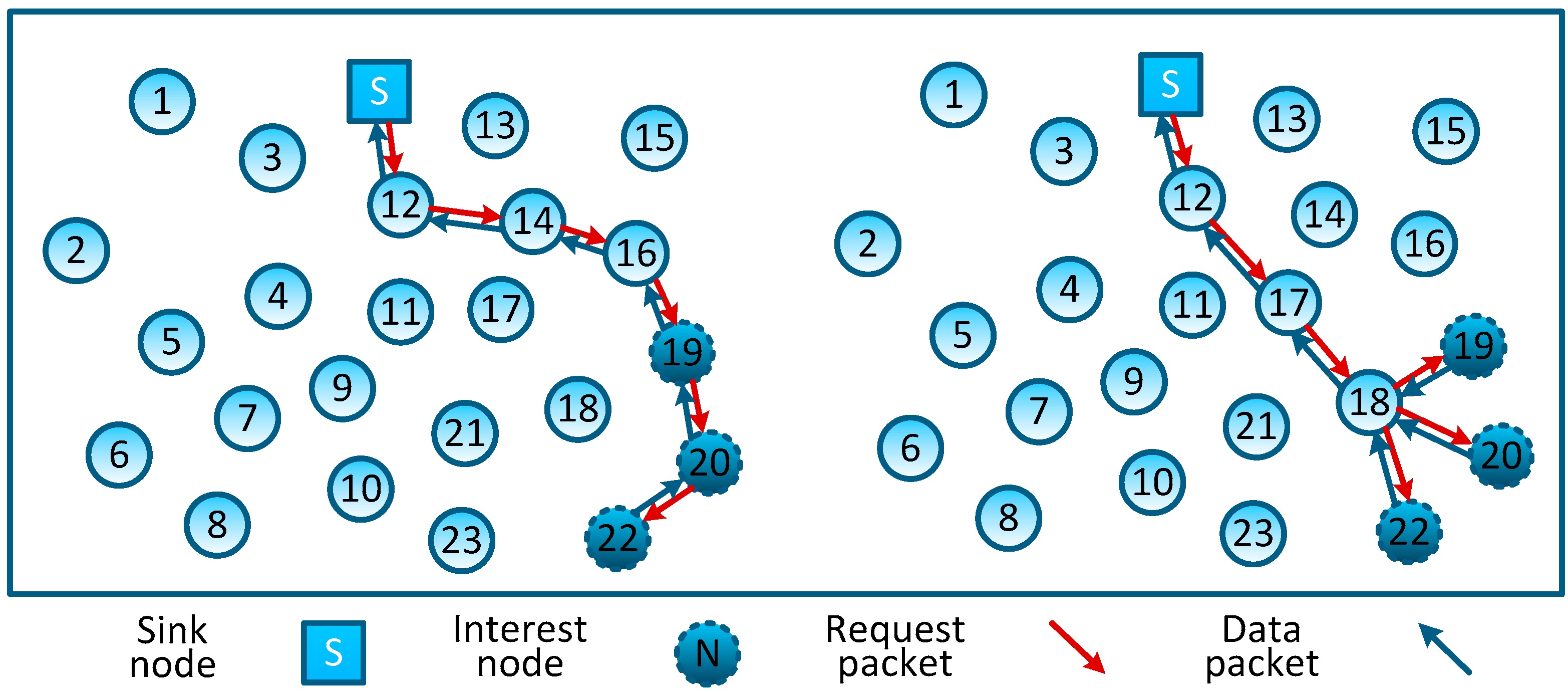 In non-aggregation data gathering schemes, data packets generated by sensor nodes are directly forwarded to the sink node through a certain topology organization (e.g., the tree-type topology as shown in Figure 2A). These data gathering schemes do not exploit the correlation of network sensed data, resulting in the network forwarding a larger number of original packets; what’s more, in addition to sending their own detected data, nodes that are closer to the sink node tend to relay a number of packets from remote nodes (e.g., in Figure 2A, node #5 forwards 11 packets while each leaf node only forwards one packet). Such an imbalance of energy consumption will inevitably lead to the quick failure of the whole network. Thus, the lifetime of nodes which are closer to the sink node forms a bottleneck in these data-gathering schemes.