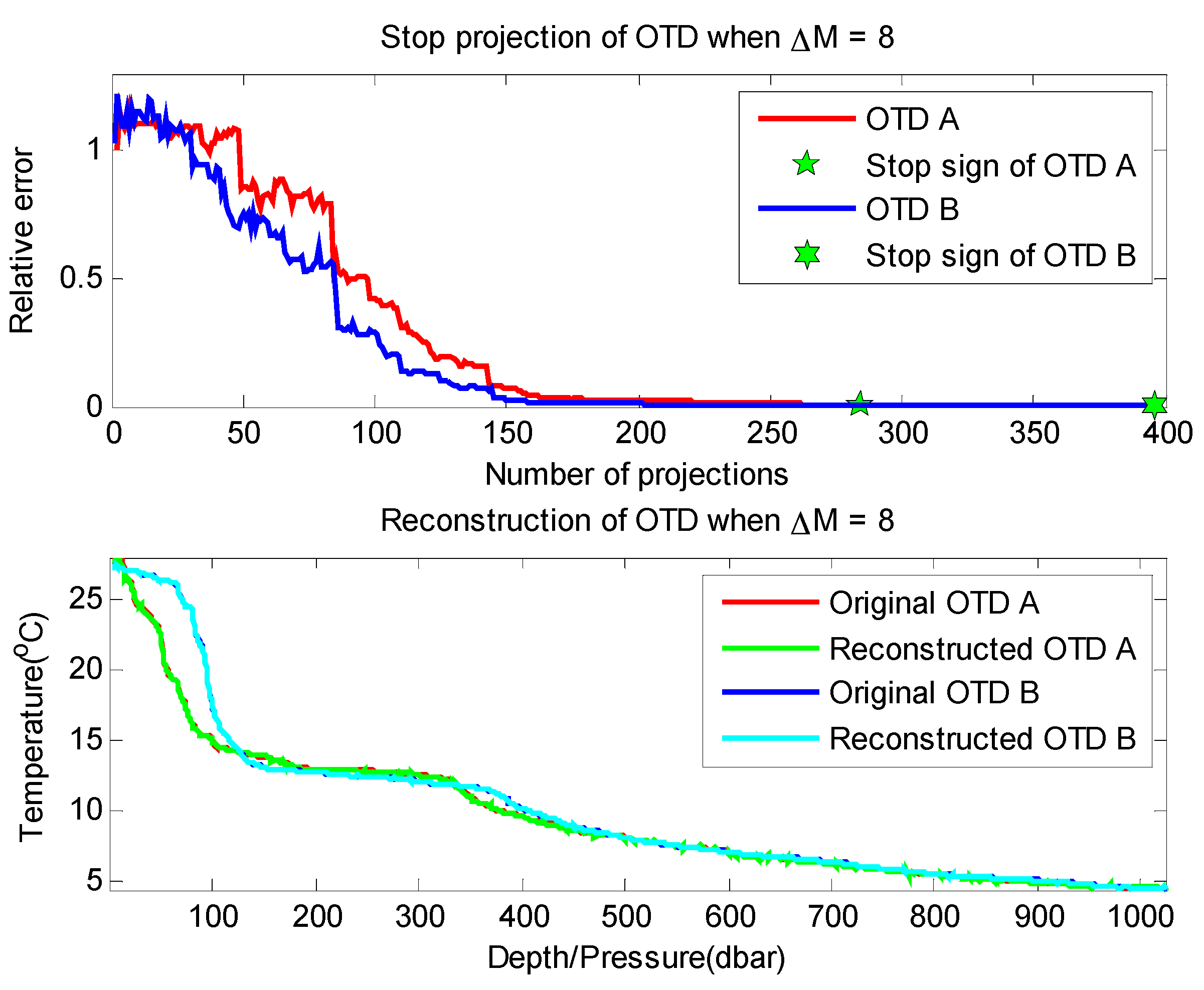 Figure 12. Experiment process (ΔM = 8) of our proposed method on OTD datasets. (top) Changing process of the relative error; (bottom) Reconstruction results.