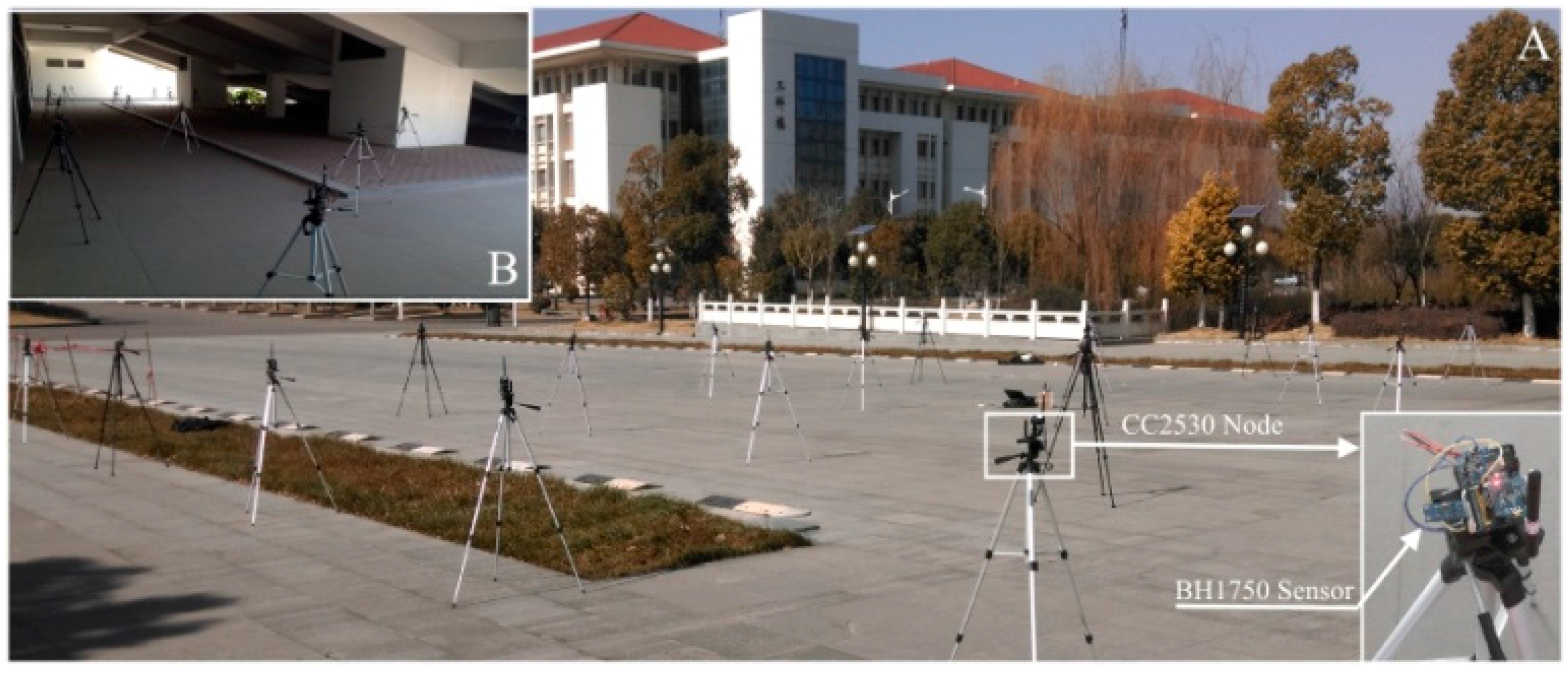 Figure 14. Network deployment of data gathering WSN. (A) Outdoor deployment; (B) Semi-outdoor deployment.