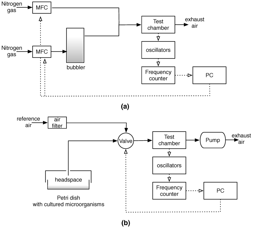 Schematic diagram of the experimental setups used for sensors calibration (a) and microorganisms measurements (b). All the parts have been hold in a ventilated hood at constant temperature and humidity. Dotted lines indicate the electrical connections.