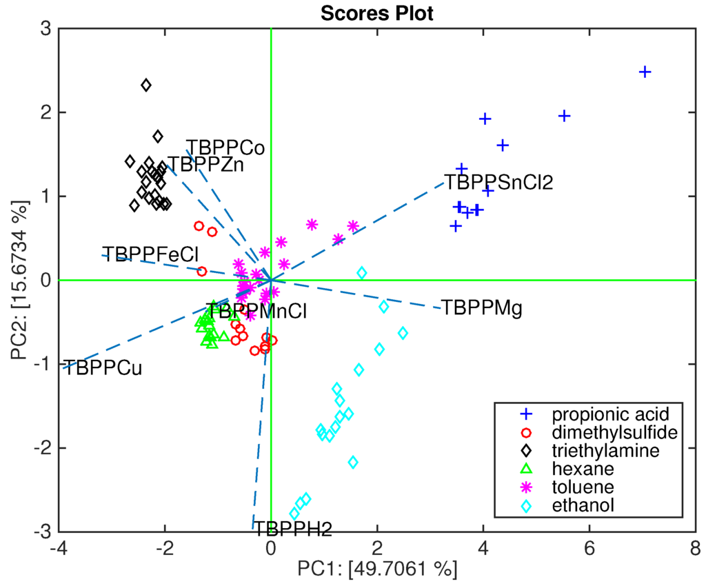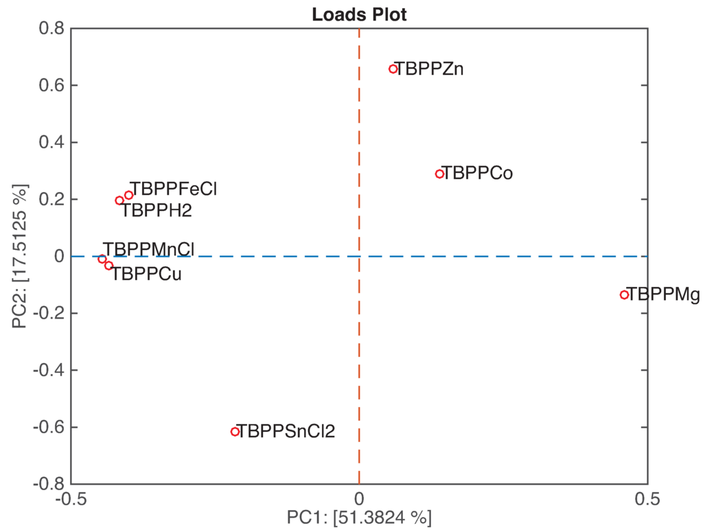 Figure 7 shows the loadings plot related to the first two principal components. In this kind of plot, we can observe the relationship between sensors and, by a comparison with the related scores plot, classes. The loadings of the couples TBPPFeCl and TBPPH2, and TBPPMnCl and TBPPCu are overlapped, meaning that these sensors are equally contributing to the plot. The above mentioned couples of sensors and TBPPMg are aligned along PC1, suggesting that these sensors are mostly sensitive to the headspace abundance. On the other hand, TBPPZn, TBPPCo, and TBPPSnCl2 are ordered along PC2.