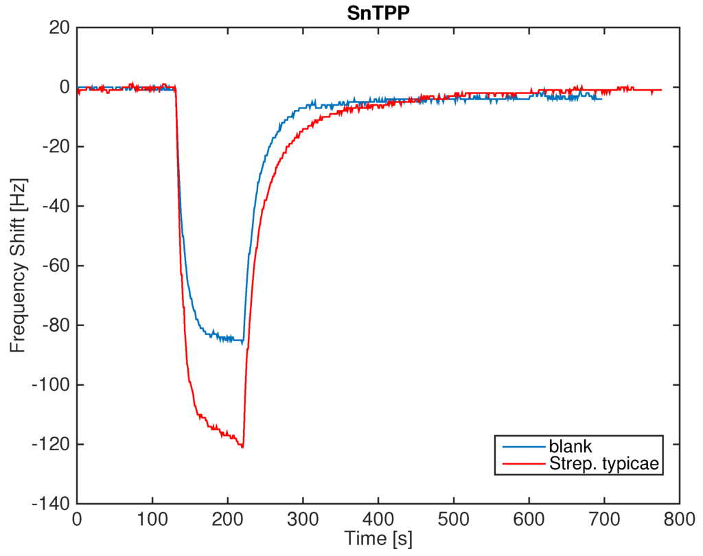 Comparison of the signals (frequency shift) of the sensor coated by TBPPSnCl2. In the figure, the responses to the blank culture media and the Streptococcus saprophyticus are shown.