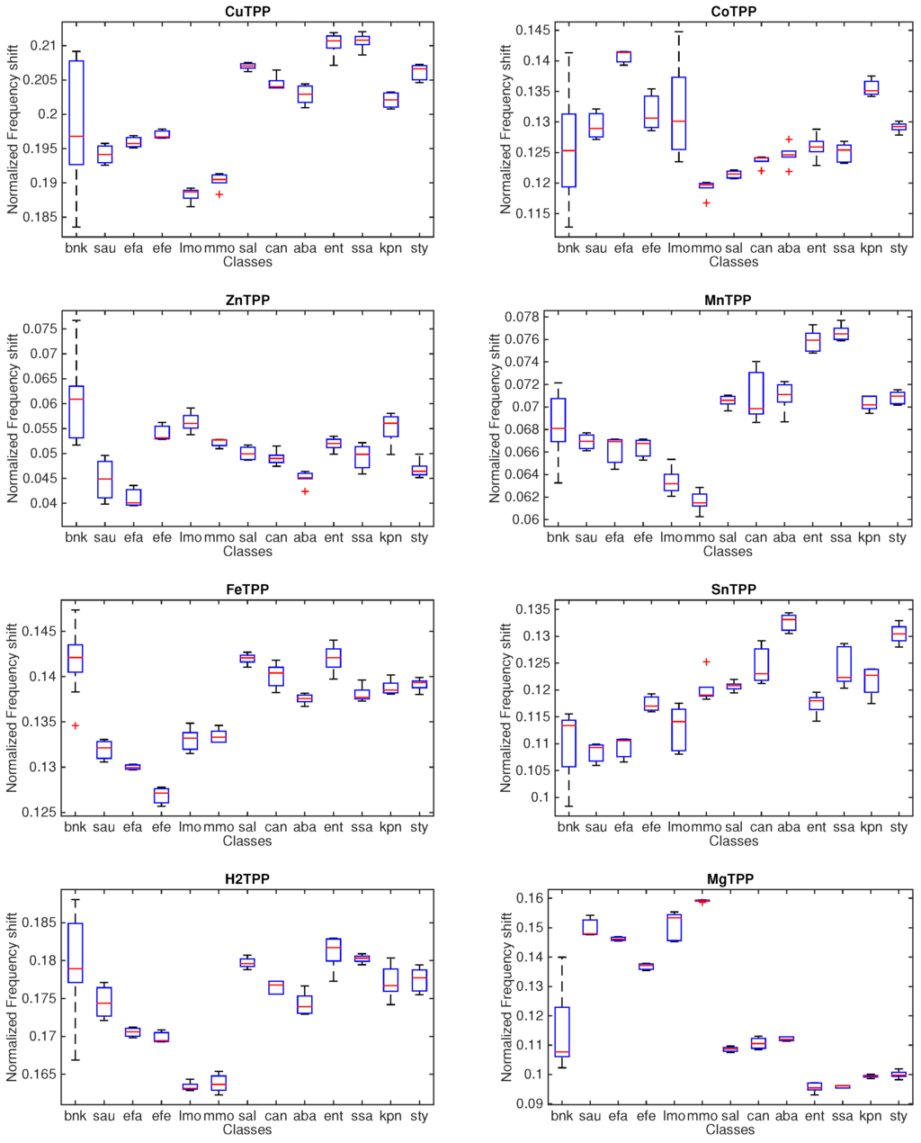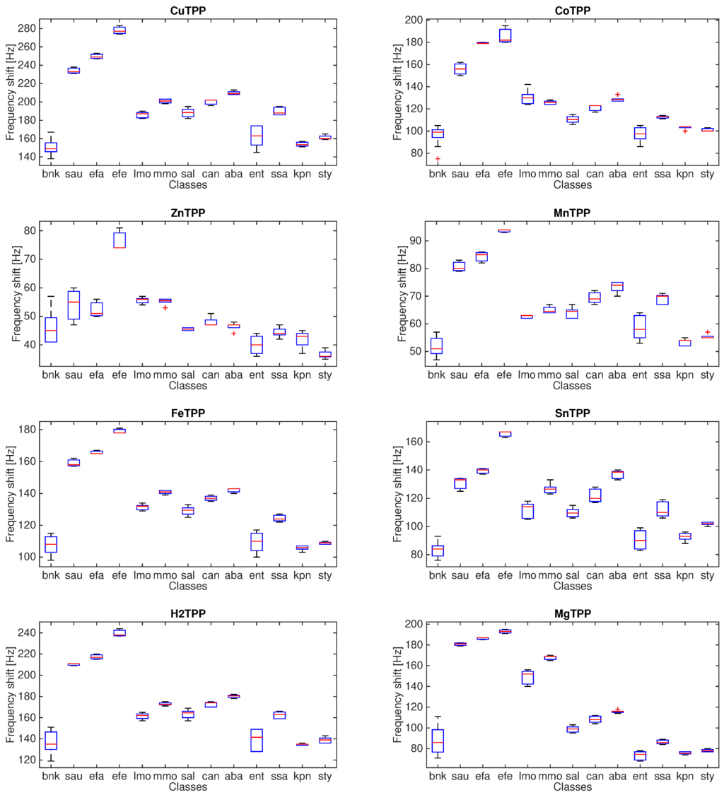 The dispersion of the measurement of each microorganism is variable and rather homogeneous for all the sensors. There is a common trend among the different sensors. For instance, TBPPCu, TBPPFeCl and TBPPH2 share the same relative magnitudes of the responses with respect to the classes. In all sensors, the responses to Enterococcus spp., Klebsiella pneumoniae, and Streptococcus typicae are closer to the blank culture media.