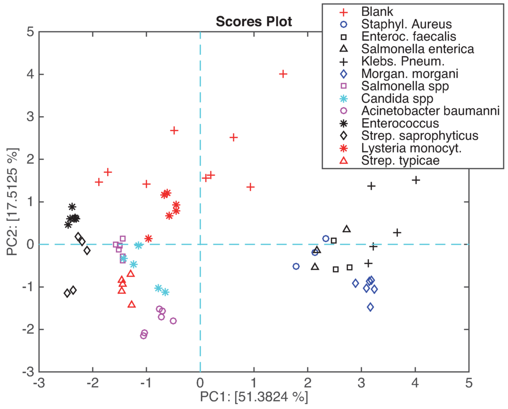 Figure 6 shows the plot of the samples in the plane of the first two principal components. In this plot approximately 68% of the total variance is represented. In the plot, the samples related to the same microorganism are plotted with the same label. The plot shows that the measurements of the same microorganism are rather well reproducible; there is a good separation among the different microorganisms. Few overlaps are shown, for instance Salmonella enterica is partially overlapped with Staphylococcus aureus. Interestingly, the blank culture media show a larger sparseness with respect to the other classes, suggesting that the presence of the microorganisms elicits a clear signature in the headspace, then less susceptible to fluctuations. To understand this plot, it is important to consider that PC1 (about 51% of total variance) describes the correlated part of the data, and it also contains the residual dependence from the abundance of the headspace. On the other hand, the difference between the blank culture media and the microorganisms is well captured by PC2 (about 17% of variance).