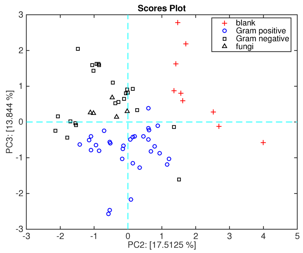 Figure 8 shows the data plotted in the plane of the second and third principal components. This plot, which explains about 30% of the total variance, shows a net separation between Gram-positive and Gram-negative bacteria. As shown in Figure 3, the second principal component segregates the blank media from the microorganisms, while the second and third plotted together achieve the separation of Gram-positive and Gram-negative bacteria.