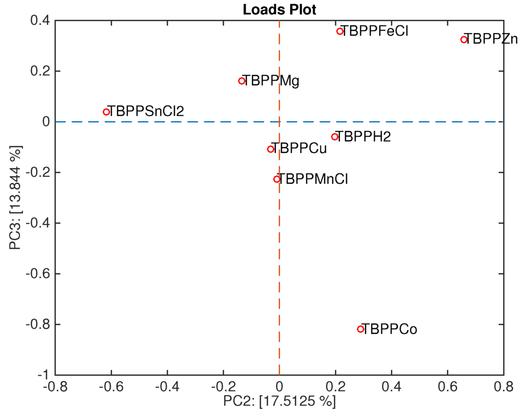 Figure 9 shows the loadings plot associated with the scores plot of Figure 6. Here, the sensors are ordered in a sequence where TBPPSnCl2 and TBPPMg points towards the space region where Gram-negative bacteria are plotted, and TBPPCo towards the opposite region, where Gram-positive bacteria are plotted.