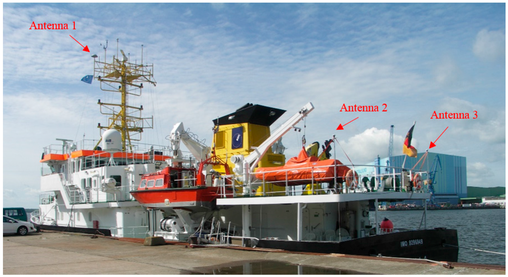 In our study, we used the data of a shipborne gravimetric campaign on the Baltic Sea which was organized by the German Research Centre for Geosciences (GFZ) and the Federal Agency for Cartography and Geodesy (BKG). The gravimetric measurements were taken near Greifswald, Germany from 18 to 27 June 2013. The ship used for this campaign including the arrangement of the GNSS antennas installed thereon is shown in Figure 1. The positions of these antennas were surveyed with respect to the local reference frame of the vessel. Thus, the distances among the multiple GNSS kinematic antennas are known and can be used to improve the accuracy and reliability of the state estimates and to control their uncertainties. However, as explained later on, the distance used in this study was determined in a different way, i.e., from GNSS observation.
