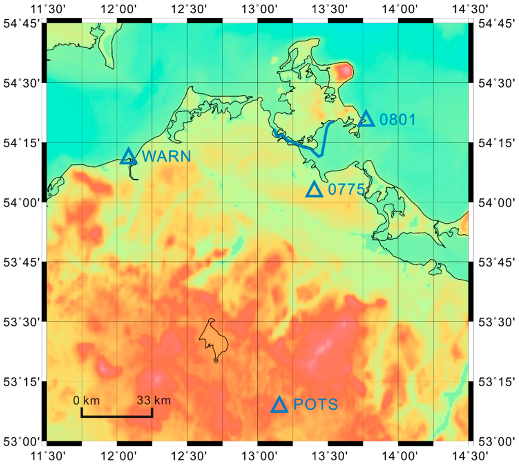 If the reference stations for a highly dynamic platform are located far away, it is difficult to get sufficiently accurate state information for a kinematic platform using GNSS precise positioning [20]. In order to investigate this context, a benchmark is needed. Therefore, here in our study, GNSS DD positioning results obtained by using the most closely located reference stations are regarded as the “true value” for the comparison with results obtained using reference stations located far away [21]. In this case, the developed method was investigated for long baseline mode for comparison. This method can be applied to airborne and shipborne kinematic platforms. However, it is difficult to get more accurate state information for an airborne platform than such as obtained from GNSS kinematic positioning. Therefore, GNSS data of the shipborne gravimetry campaign on the Baltic Sea were used to illustrate the methodology, since the state information for a kinematic platform from the GNSS ultrashort baselines can be used as a true value to compare it with the state information from GNSS long baseline.