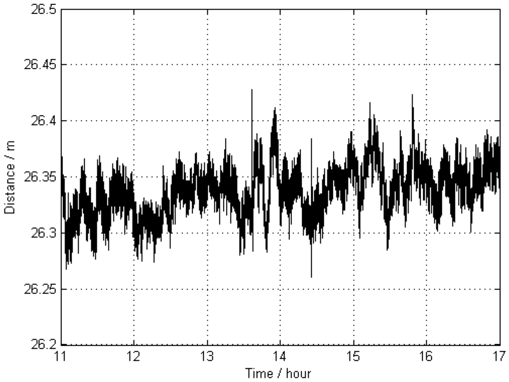Apparent distance (as a function of time) between the two antennas KIN1 and KIN3 without distance constraints; the trajectories of these antennas were estimated by using two far-away-located reference stations, WARN and POTS (Scheme 2).