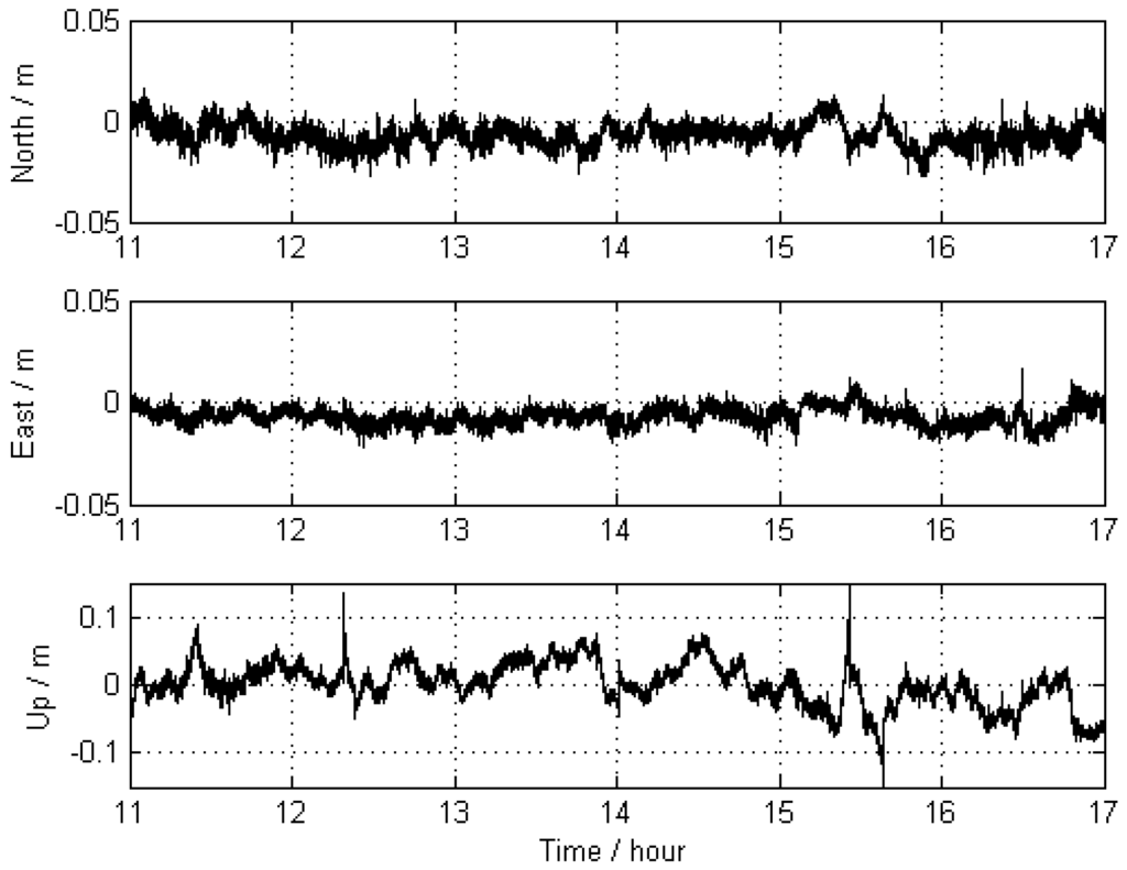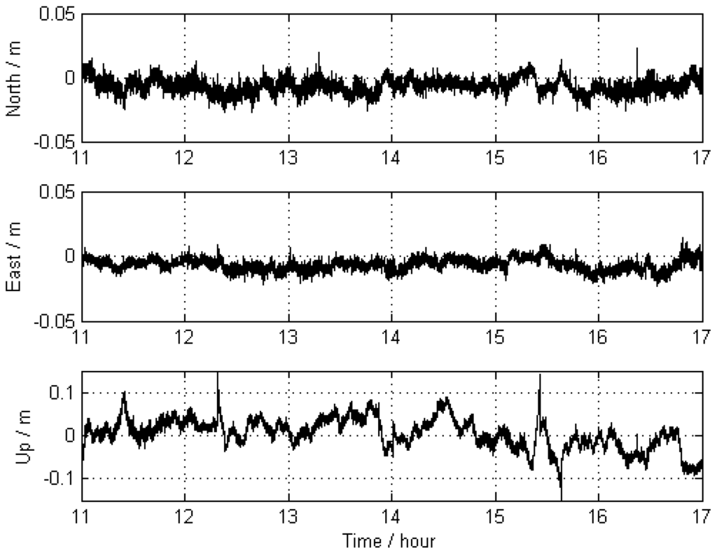As already explained, in order to demonstrate the capability of our approach, the state information of kinematic platform was first calculated using the nearby reference stations. These results were treated as “true values” for comparison. Then, the state information of the kinematic platform was calculated using the far-away reference stations and was regarded as benchmark. Finally, our new approach with a priori constraints was applied to this configuration. The improvement due to the new approach should be obvious from these comparisons. For this purpose, three experimental scenarios were realized with the following computational schemes: