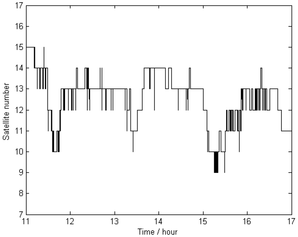The trajectories of KIN1 for the reference stations located far away were compared with the “true value” of Scheme 1. The comparison results are displayed in Figure 6, and their statistics are given in Table 3, showing that the achieved accuracy (in terms of RMS) is 5.8 mm, 4.5 mm, and 36.8 mm for the north, east, and up directions, respectively. The large deflections that appear in Figure 6 between hours 15 and 16 are obviously caused by a lower number of visible satellites at that time. The total number of visible satellites (GPS plus GLONASS) is shown in Figure 7.