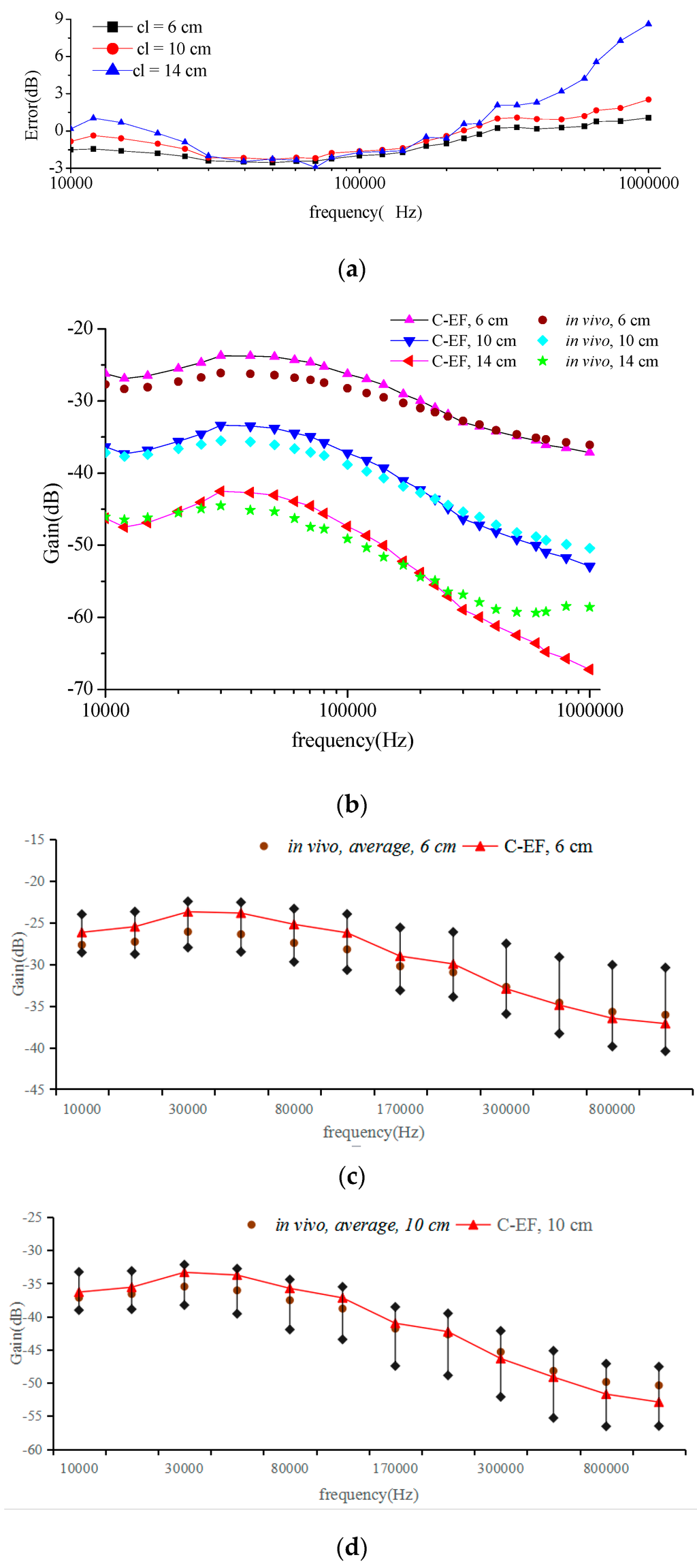 Figure 10 shows the comparison of the in vivo tests and the estimation results based on the flow chart in Figure 7. Including the voltage gain of the channel length 6 cm, 10 cm, 14 cm and the errors between the measurement and the estimation.